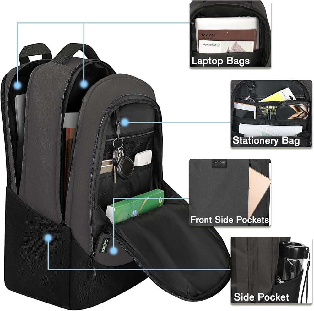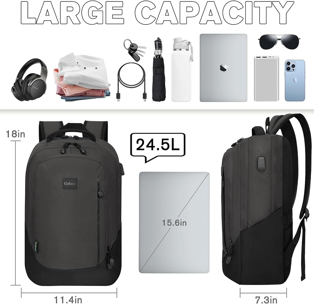 Material and Size: Goloni casual laptop backpack / mochila with USB charging port is made of Durable Polyester / Water-resistant base material fabric which makes it sturdy and lightweight. The backpack SIZE is 18*12*7'' (Weight:0.57KG/1.25LB), easy to organize all personal items and fit up to 17" inch laptops bag