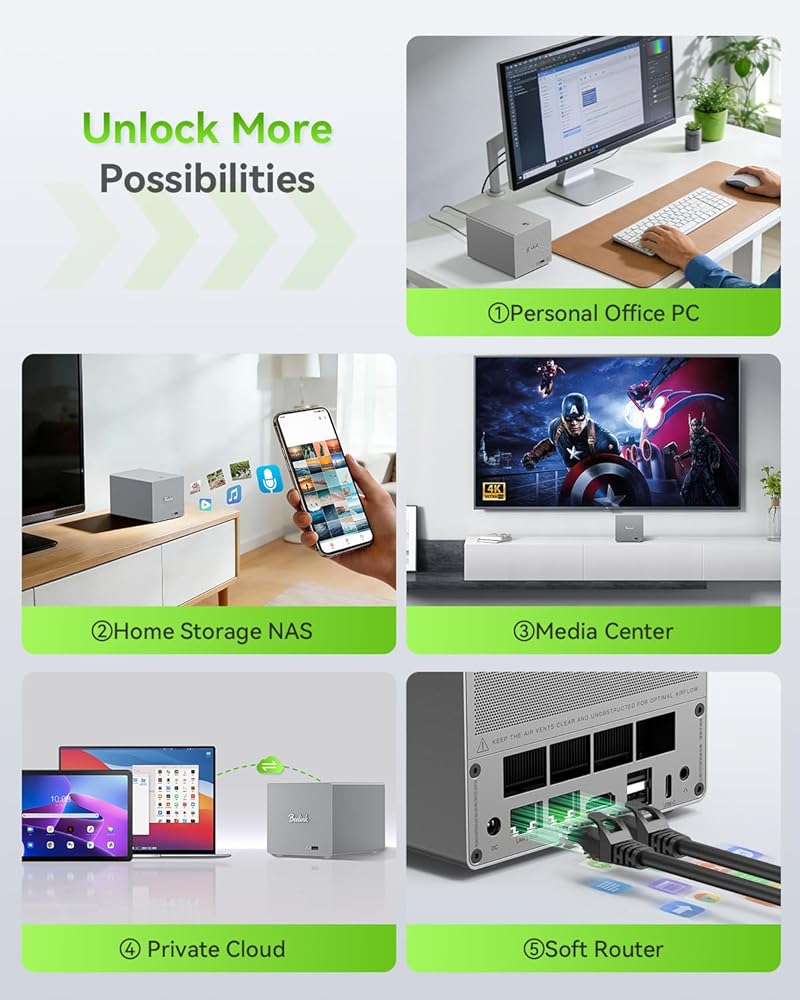 High-Speed Network: The N100 mini pc has built-in the latest WiFi 6 (802.11ax) and Bluetooth 5.2. High-speed wireless connection technology, reliable and efficient transmission speed, ensure Beelink Mini S12 Pro can easily connect to wireless devices like mouse, keyboard, monitoring camera, printer, monitor, TV, projector. The small form factor also supports Wake On LAN, PXE Boot, RTC Wake and Auto Power On
