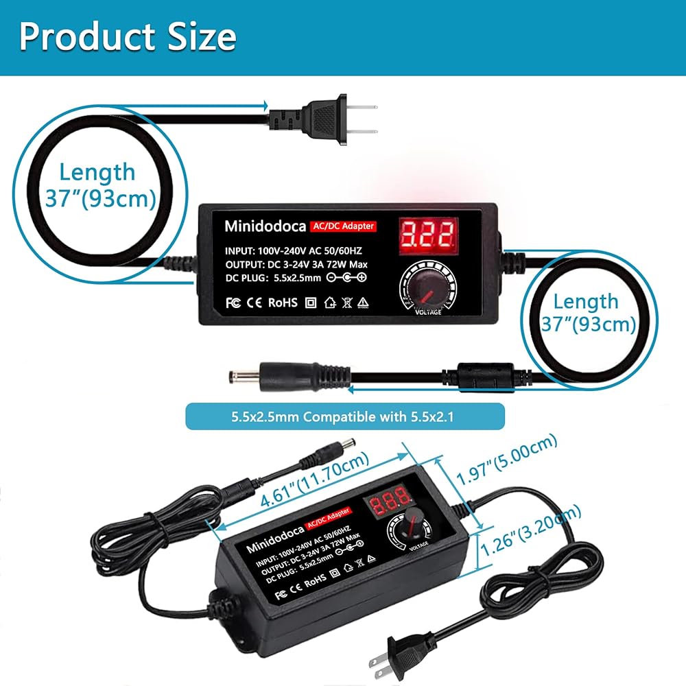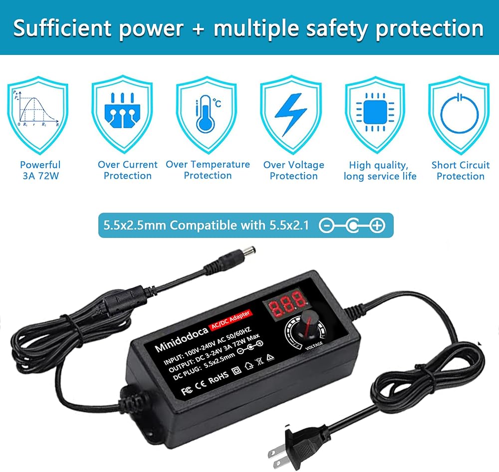 72W Power Supply Adjustable DC 3V ~ 24V Variable Universal Switching AC/DC Adapter Minidodoca AC to DC Converter with LED Voltage Display and 13 Tips, for 3V to 24V Household Electronics - 3000mA Max