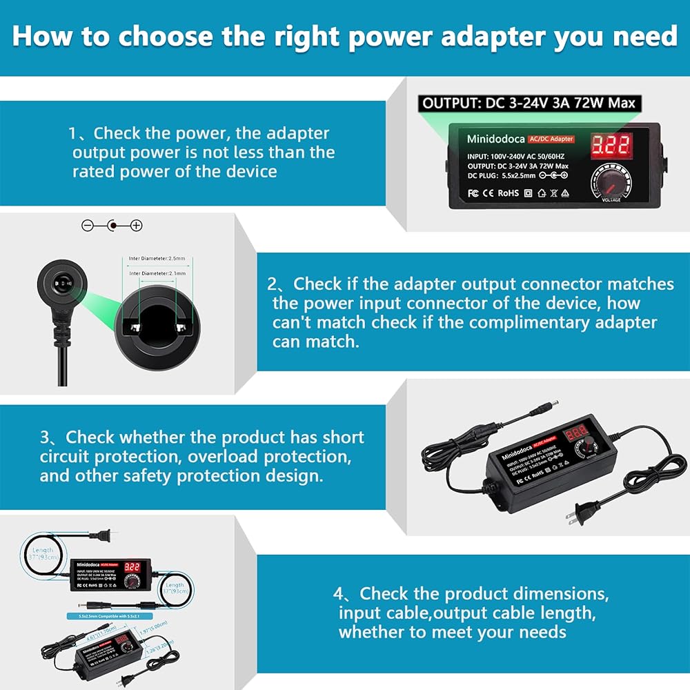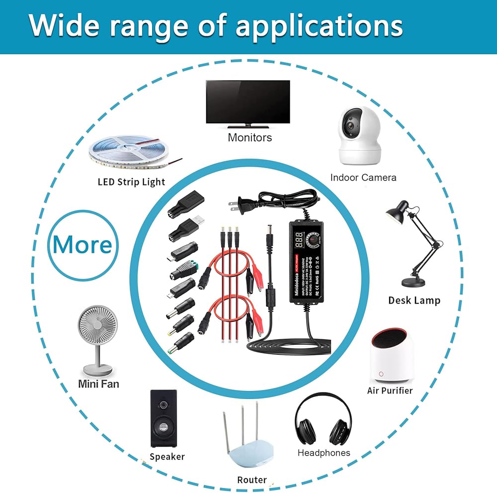 【Adjustable Voltage】Input: AC 100~240V, 50/60Hz, Output Voltage can be adjusted from 3V to 24V DC (such as 3V 4V 4.5V 5V 5.5V 6V 9V 12V 14V 15V 19V 20V 24V). Wattage Max 5A, 120W; It can supply with amps less than 5A, such as 300mA, 500mA,1A, 1.5A, 2A, 2.5A, 3A,5A.