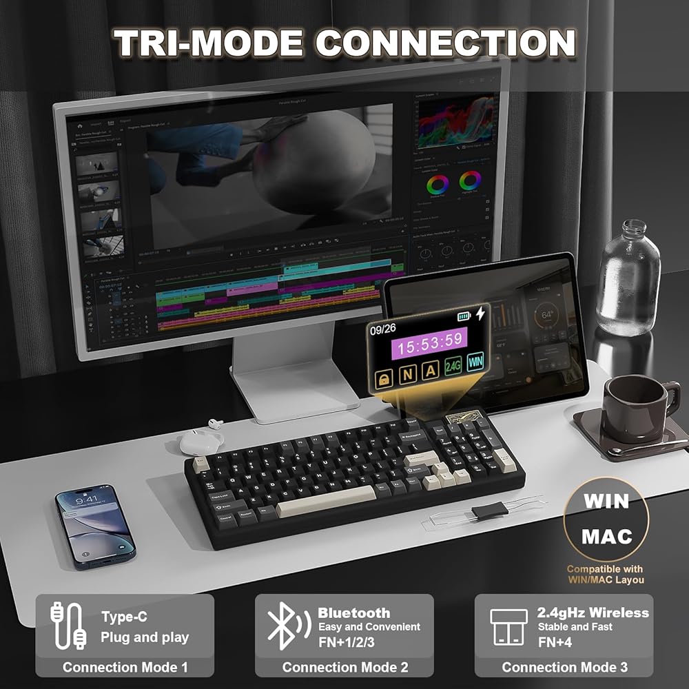 Tri-Mode Connectivity & Long-lasting Battery:YUNZII IF99 wireless mechanical keyboard provides three connection methods, easily switch between BT5.0, 2.4GHz wireless, and USB-C wired modes. The Win / mac keyboard connect up to 5 devices, like tablet, PC, phone, laptop, and even gaming consoles like PS and Xbox. With the high-capacity 8000mAh battery, 1000hz polling rate of the mechanical keyboard wireless, you can work and game longer without frequent recharges, designed to keep you focused on gaming, work, or programming without frequent recharging.