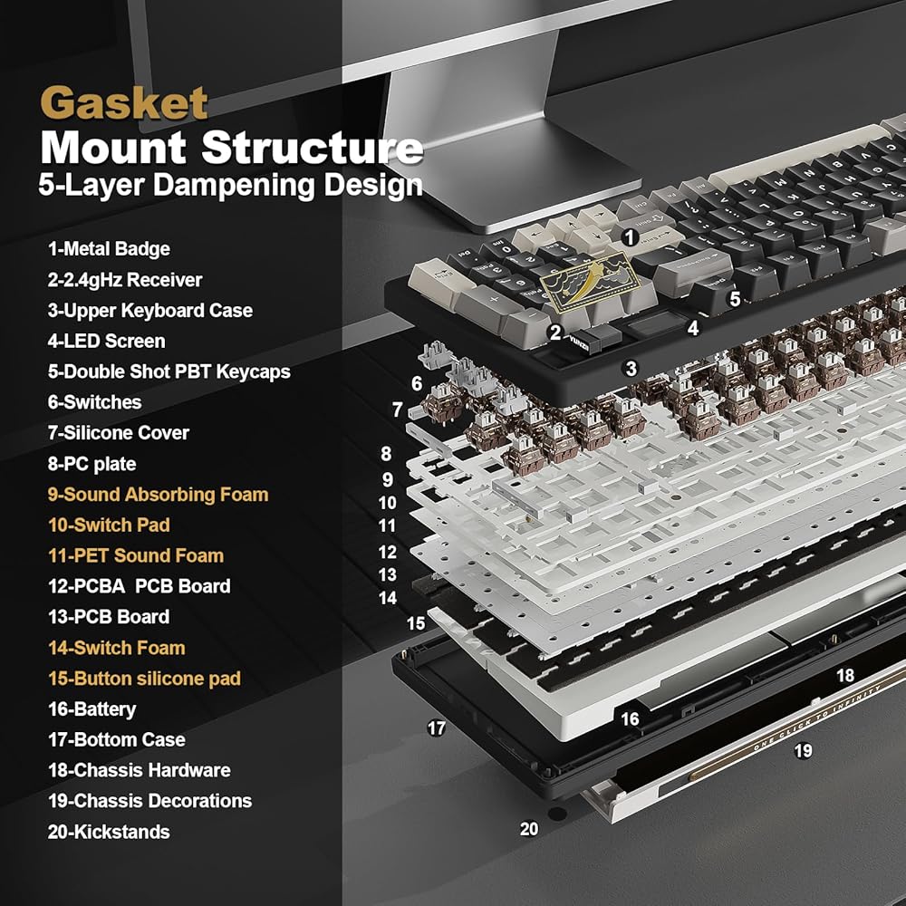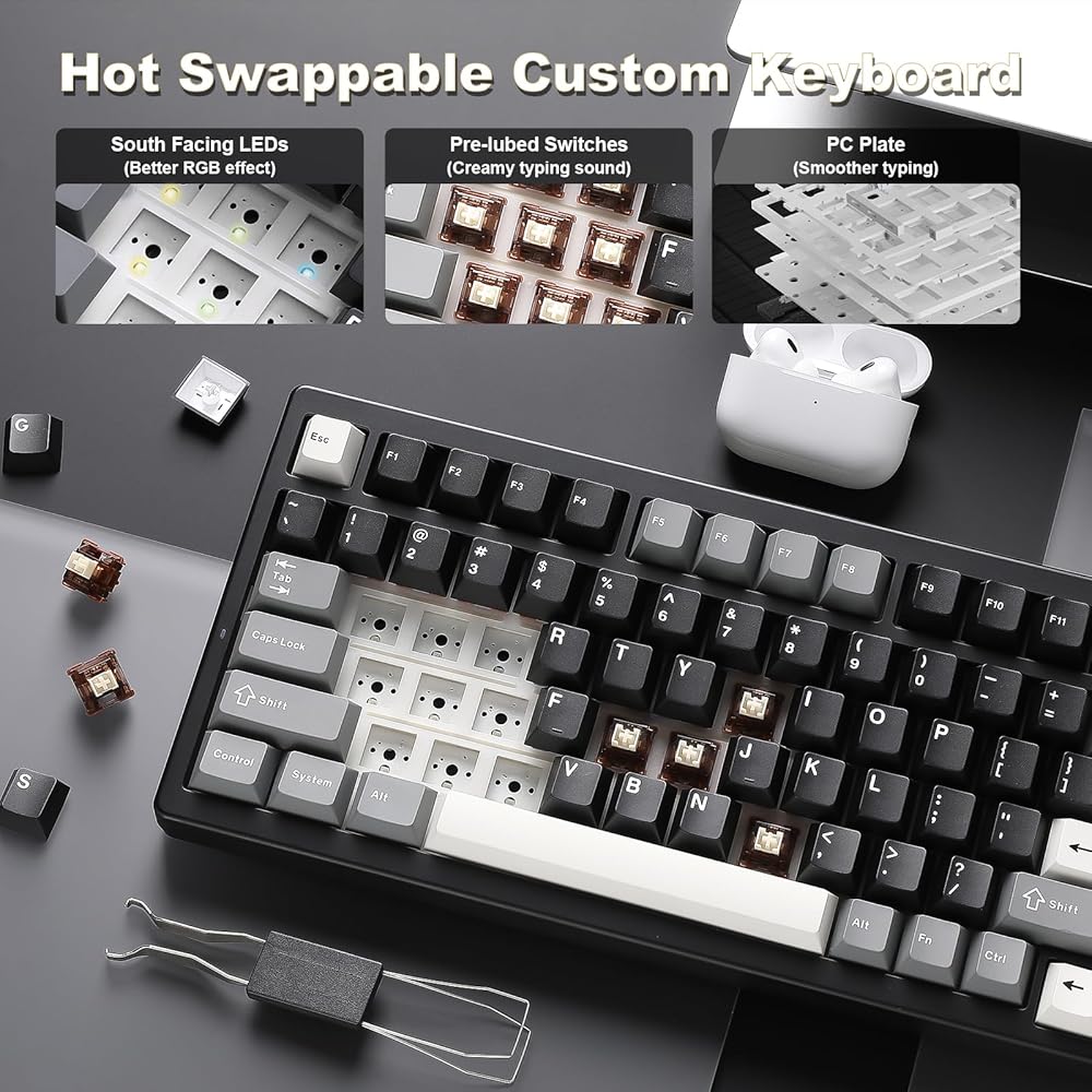 Gasket Mount Hot Swappable Gaming Keyboard:This creamy keyboard with number pad features a gasket-mounted design with multiple layers of sound-absorbing material, reducing noise and enhancing typing comfort. The full-key hot-swappable thocky keyboard allows you to easily swap out 3-pin or 5-pin switches to customize the tactile keyboard feel and creamy keyboard sound of every keystroke.
