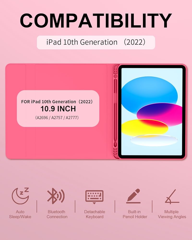 【Compatibility Model】This iPad case with keyboard is designed for iPad 10th Generation 2022 10.9 inch. ( Model: A2696/A2757/A2777 ). NOT compatible with any other iPad models. Please check the back bottom of your iPad to find the model number before placing order.