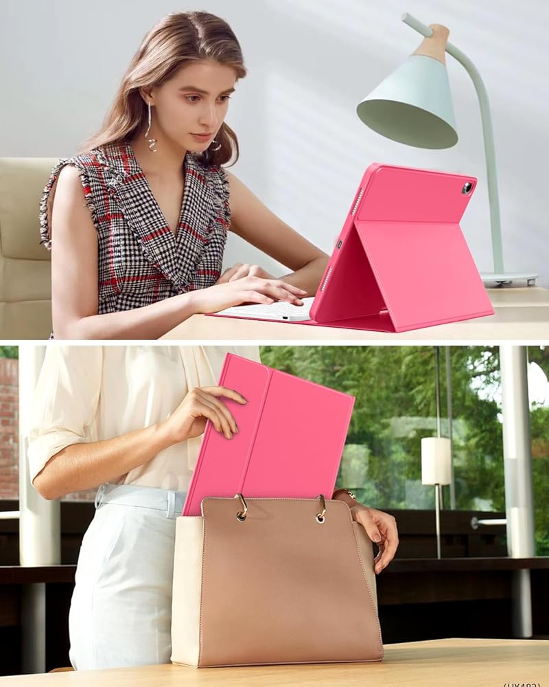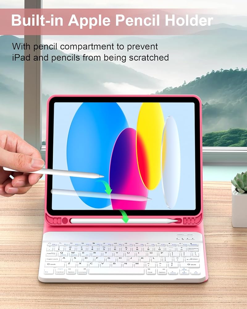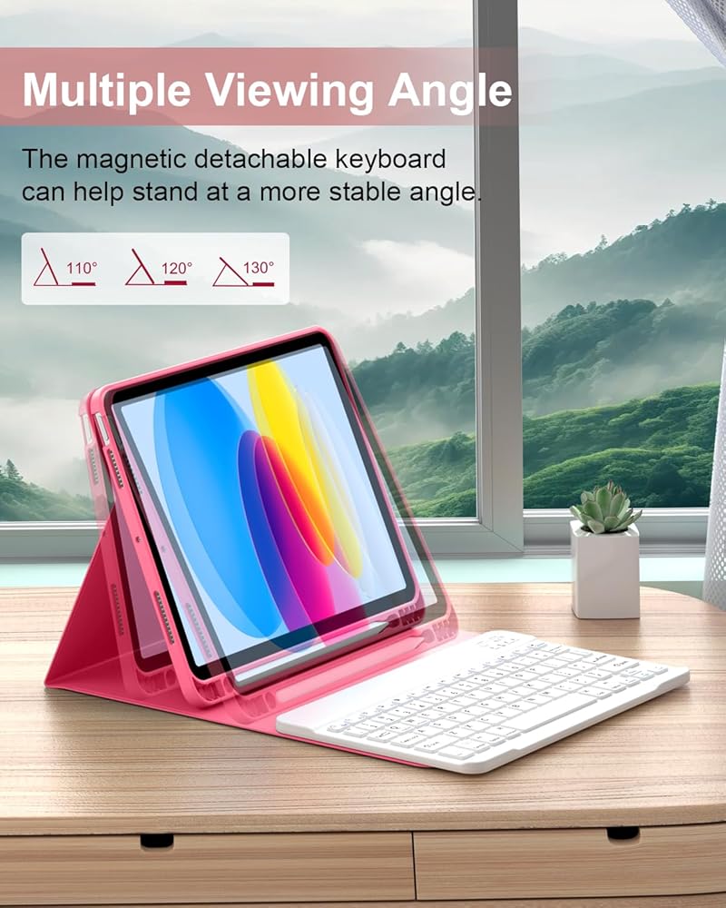 【Multiple Viewing Angle and Pen Holder】For iPad Keyboard Case for 10.9" 10th Gen is magnetically attached and very versatile and the thoughtful design easily adjusts to whatever comfortable angle suits you best.That makes the IPad work like a laptop,so it's Perfect for working, writing, taking notes,typing and editing or watching videos. Let you can be efficiency and other stuff that need to get done quickly.It has a pen slot inside to prevent the apple pen from being lost.