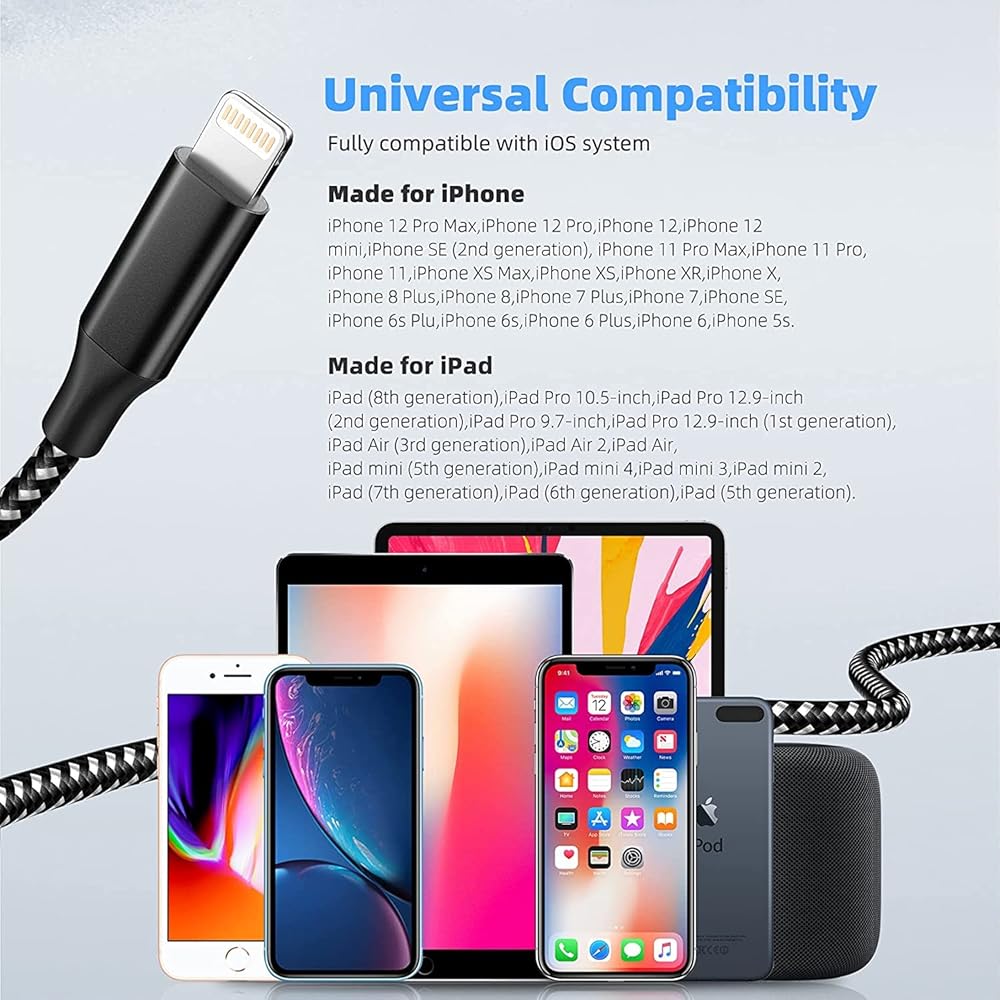 【Universal Compatibility】: Our apple charger cable are perfectly compatible with iPhone 14/iPhone 14 Pro/iPhone 14 Pro Max/iPhone 14/13/iPhone 12 Pro Max/12 Pro/12/iPhone 11 Pro/iPhone 11 Pro Max/XS/Max/XR/X/8 Plus/8/7 Plus/7/6s Plus/6s/6 Plus/Air 2/mini/mini 2/mini 4 etc.