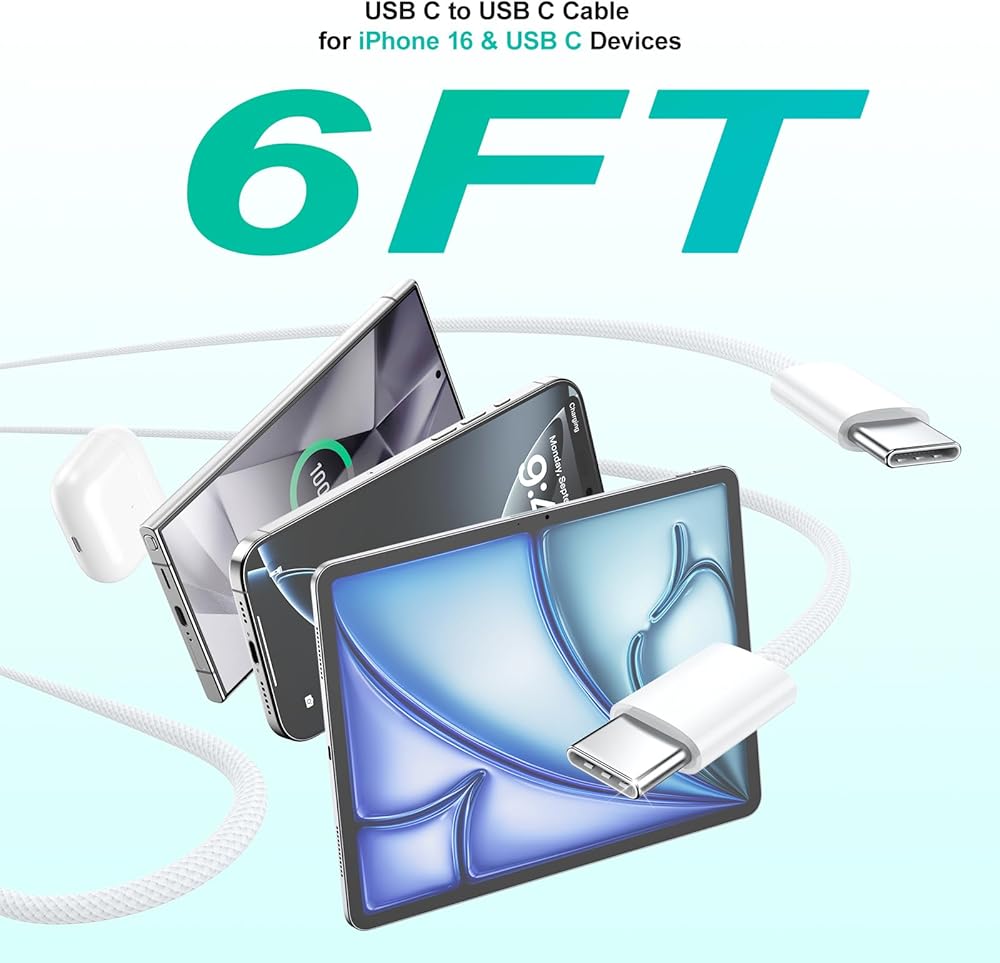 USB C to USB C Cable for iPhone 16: Package comes with 6ft USB C to C cable, which is compatible with iPhone 16 and iPhone 15 full series. Compared with normal PVC/TPE material USB C cables, ours is covered by 48 strand nylon, which is stronger and tangle-free. It's more friendly for family have pets. 6ft is long enough to let you lie on the bed, stay on the sofa during charging. (Please prepare a suitable cable by yourself if you're charging a device which isn't Type C port.)