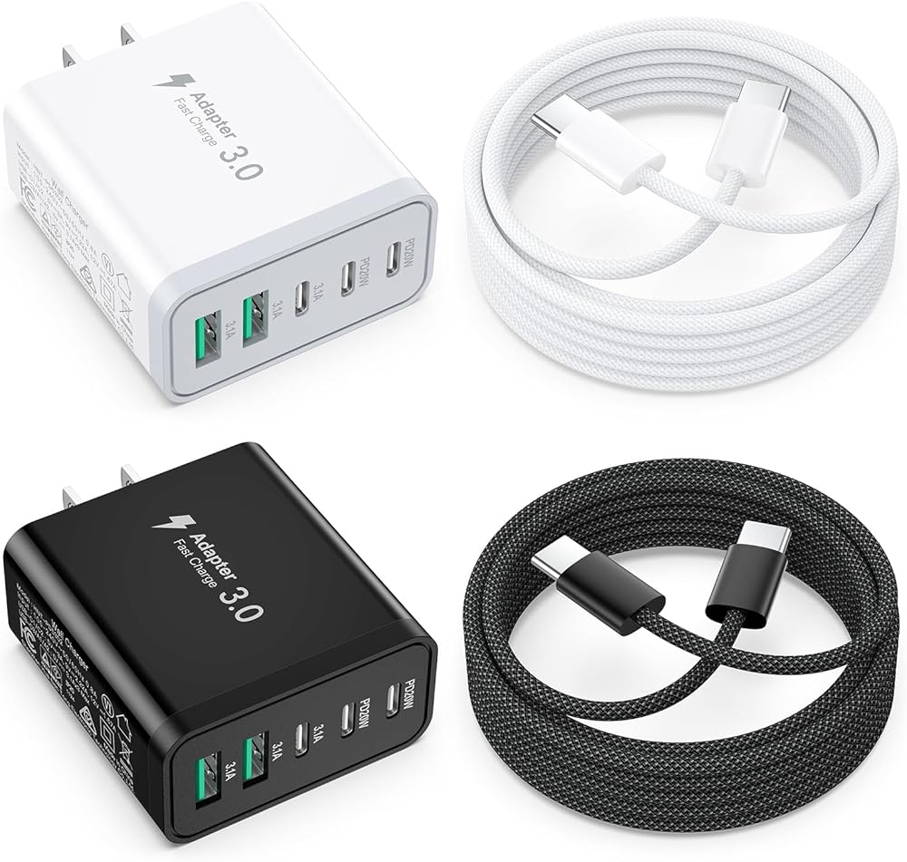 USB C Charger Block, Besgoods 50W Multiple Ports Fast Charging Block for iPhone 17 Pro Max, USB-C USB-A Phone Charger 5 Devices 6ft Braided C to C Cable for iPhone 16 15 iPad Galaxy, 2Pack