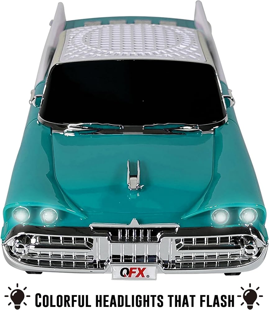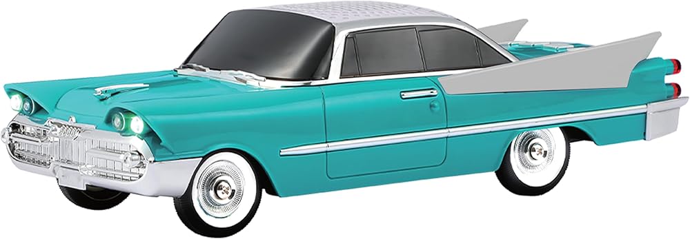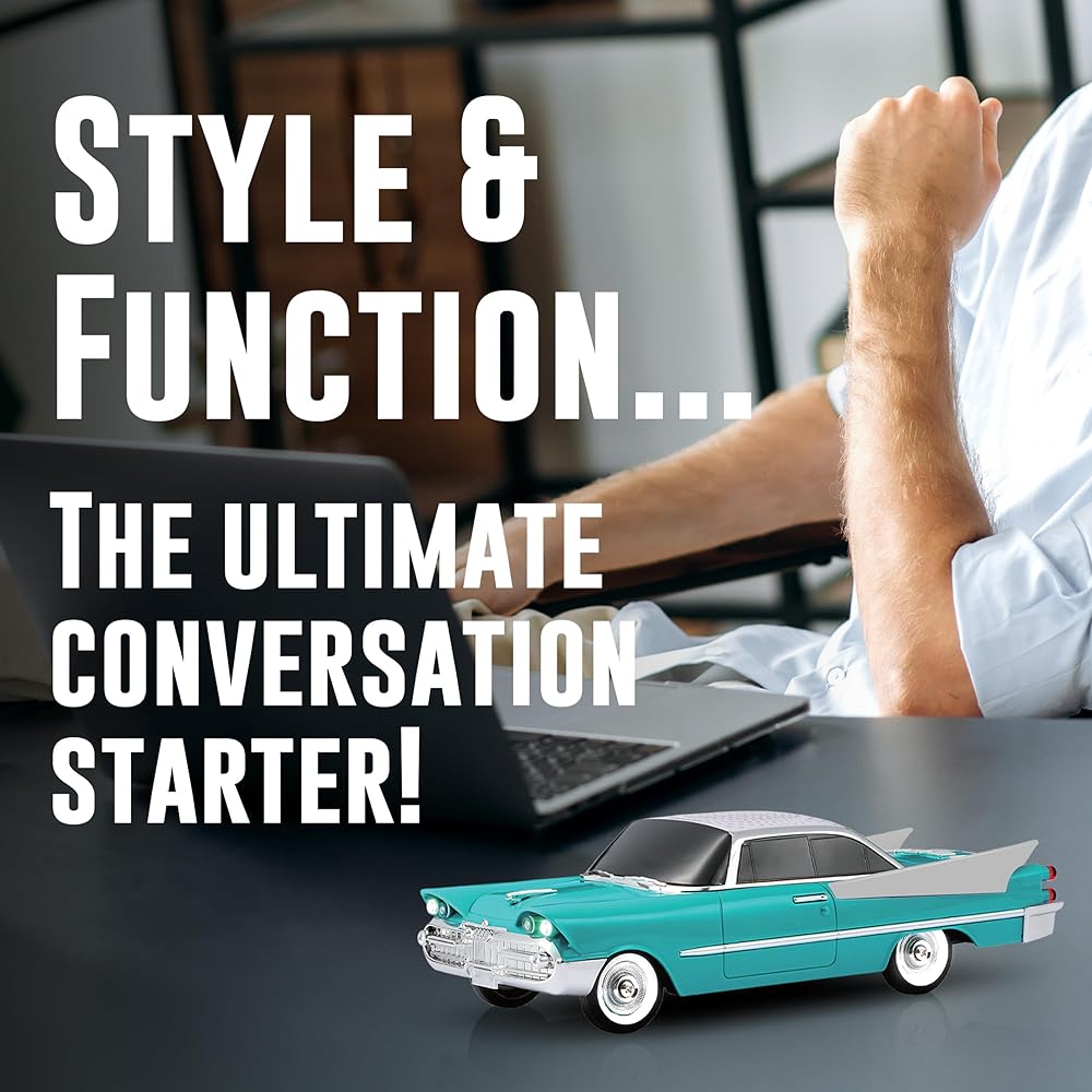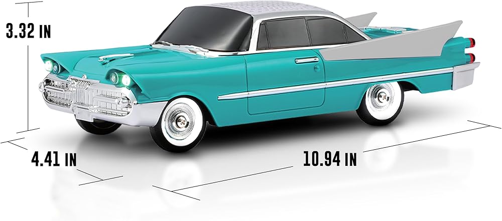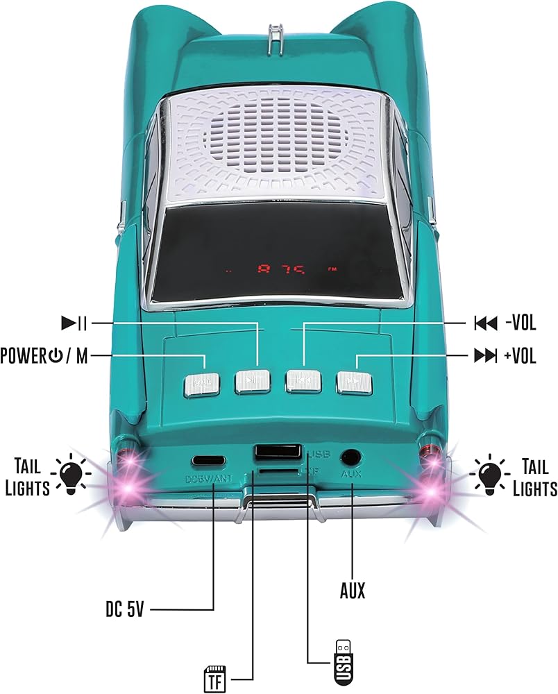 RETRO STYLE, MODERN SOUND - 1950s-inspired car design with dual 2” speakers and a bass radiator for enhanced audio performance.
