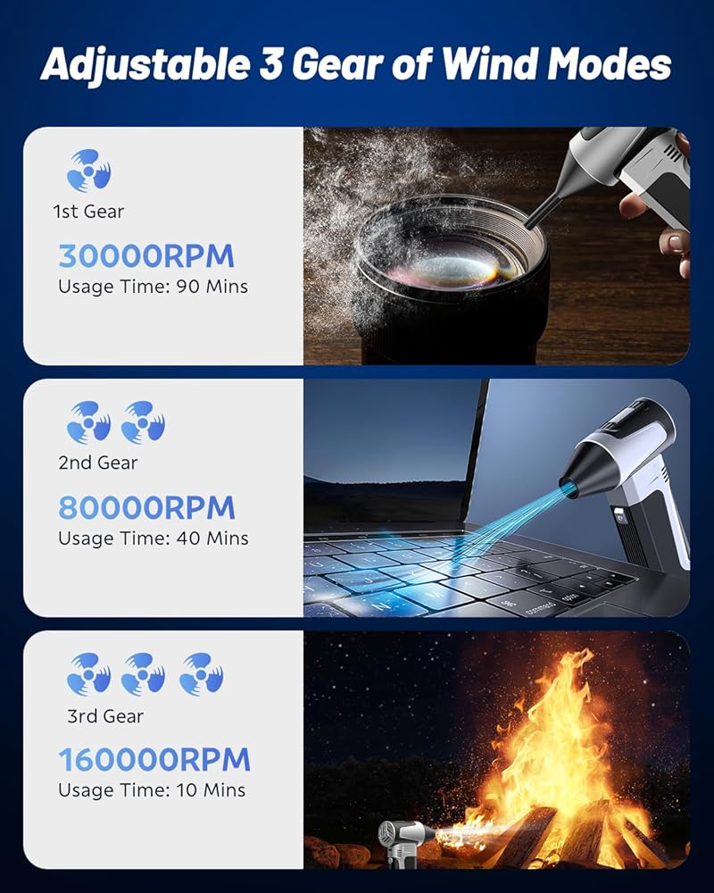 3 Adjustable Speeds for Versatile Use: Switch between three speeds (30,000 RPM, 80,000 RPM, and 160,000 RPM) to handle everything from light dusting to heavy-duty cleaning. Whether it's delicate camera lenses or DIY wood shavings, this air blower adapts to your needs.