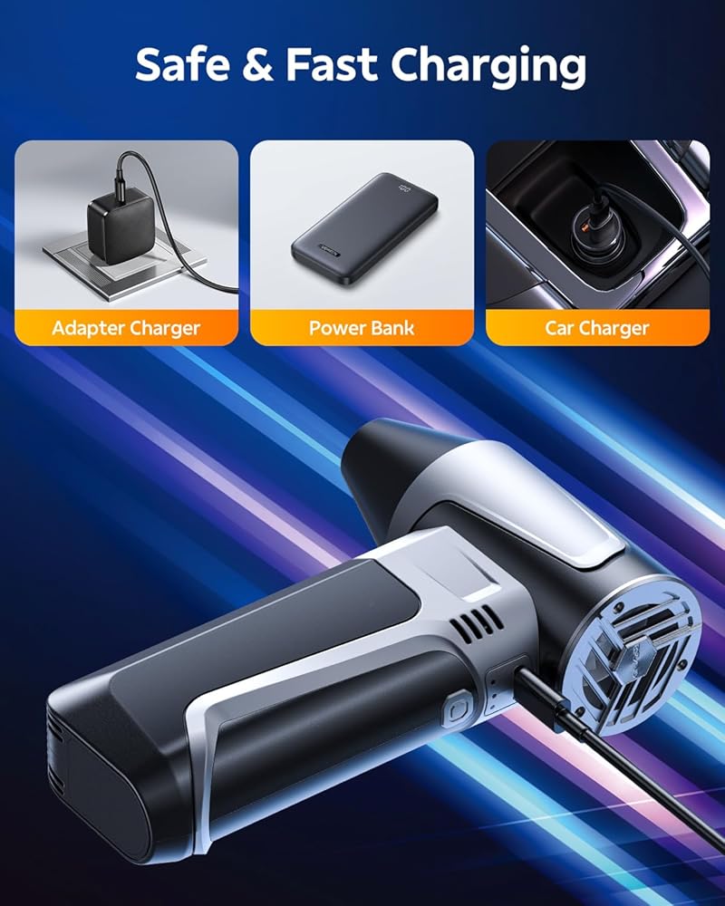 Powerful Cleaning with 160,000 RPM Motor: With a high-speed 160,000 RPM motor, this electric air duster tackles dust and debris in even the hardest to reach spots, perfect for cleaning electronics, car interiors, and more. Get rid of dirt fast with up to 10 minutes of turbo-powered airflow.