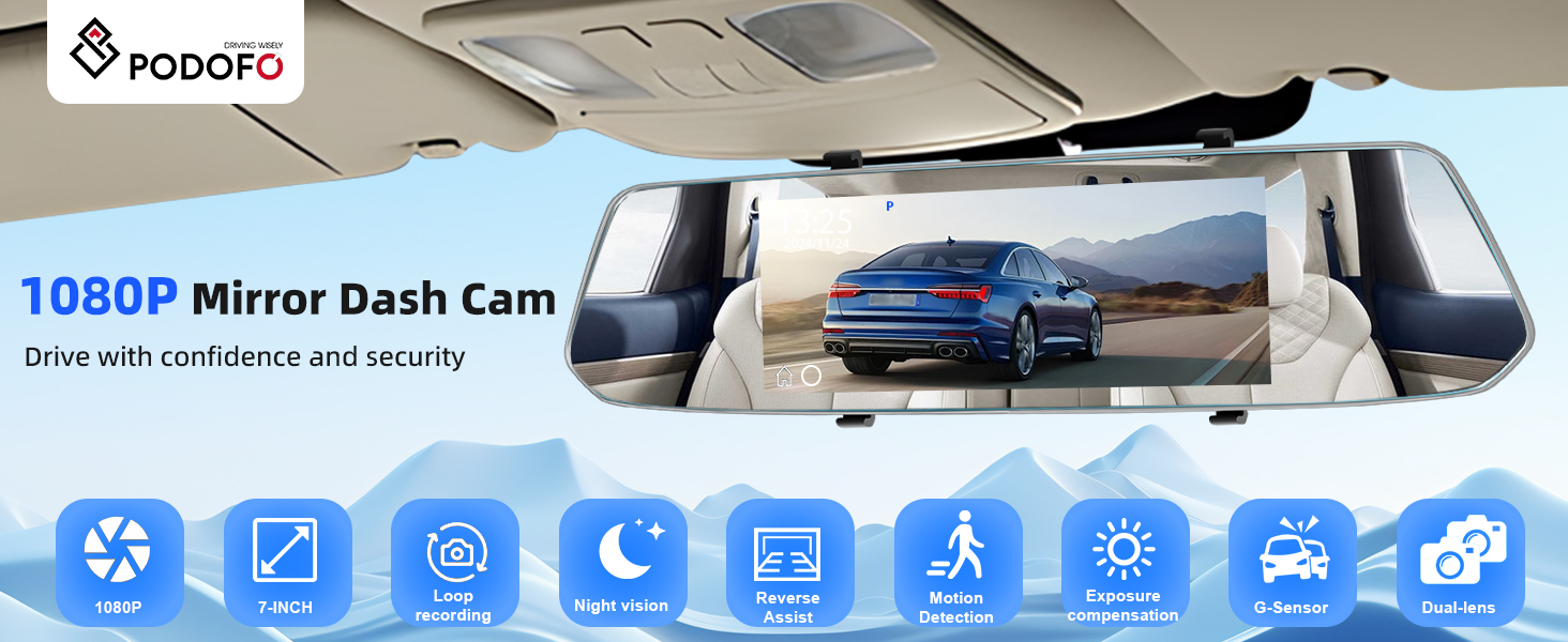 Podofo Mirror Dash Cam for Cars,7" Rear View Mirror 1080P Front and Rear View Dual Cameras,Super Night Vision,Parking Assistance,Loop Recording,Motion Detection,Waterproof Backup Camera for Cars+64G