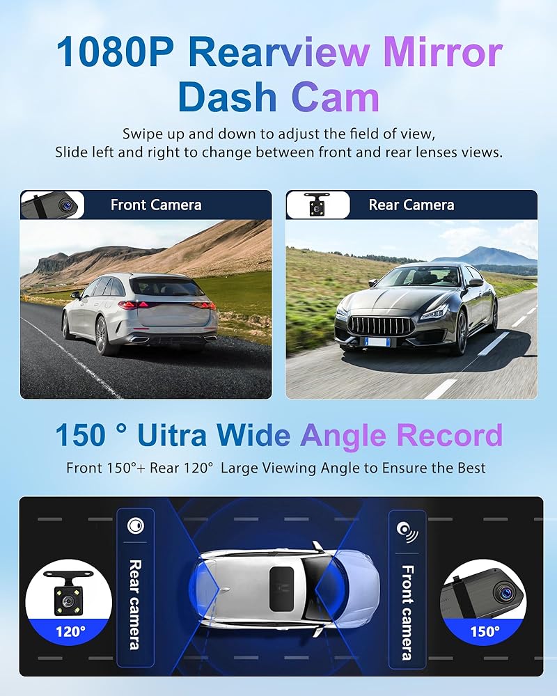 【1080P 12 Inch Mirror Dash Cam】: Upgraded 7-inch screen rearview mirror, equipped with 1080P front camera and 1080P rear camera. Using large diameter front and rear lenses and mature WDR technology. With aurora capture technology, the image can be brightened or darkened when encountering tunnels, night lights, etc. The adjustable front camera and 120° rear camera cover almost the entire field of view, reducing blind spot areas and capturing more road scenes.