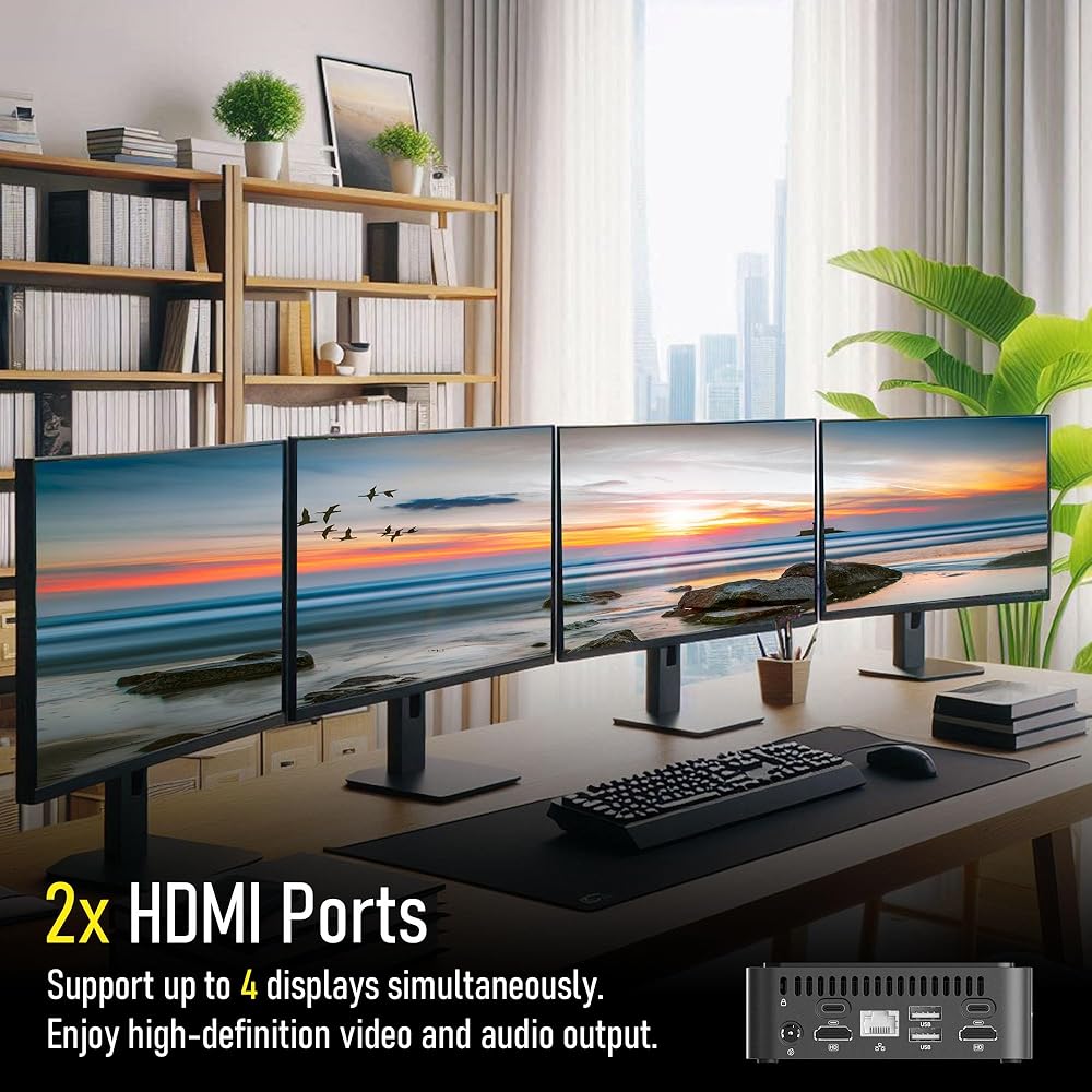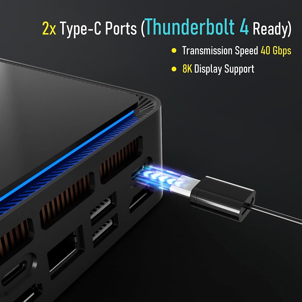 【8K, Four Display Support】The Prittec F8 features Intel UHD Graphics, delivering powerful graphics processing capabilities and supporting 8K video playback. It can connect to a projector for a home theatre experience, perfect for various entertainments. With two HDMI 2.0 ports and full-function Type-C ports, you can efficiently multitask across four displays.