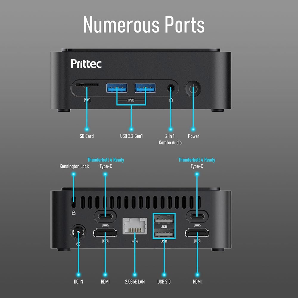 【Various Connections and Ports】The Prittec F8 comes with 2 USB 2.0 ports, 2 USB 3.2 Gen 1 ports, 2 HDMI ports, 2 Type-C ports, a 2.5Gb RJ45 LAN port, 2-in-1 combo audio, WiFi 6, and Bluetooth 5.2. With 2.5Gb Ethernet, you can enjoy fast internet connections and high-speed browsing. These features make it easy to connect multiple devices and enhance your workspace.