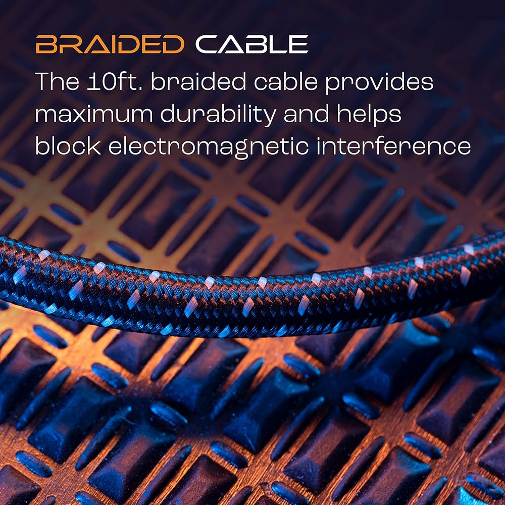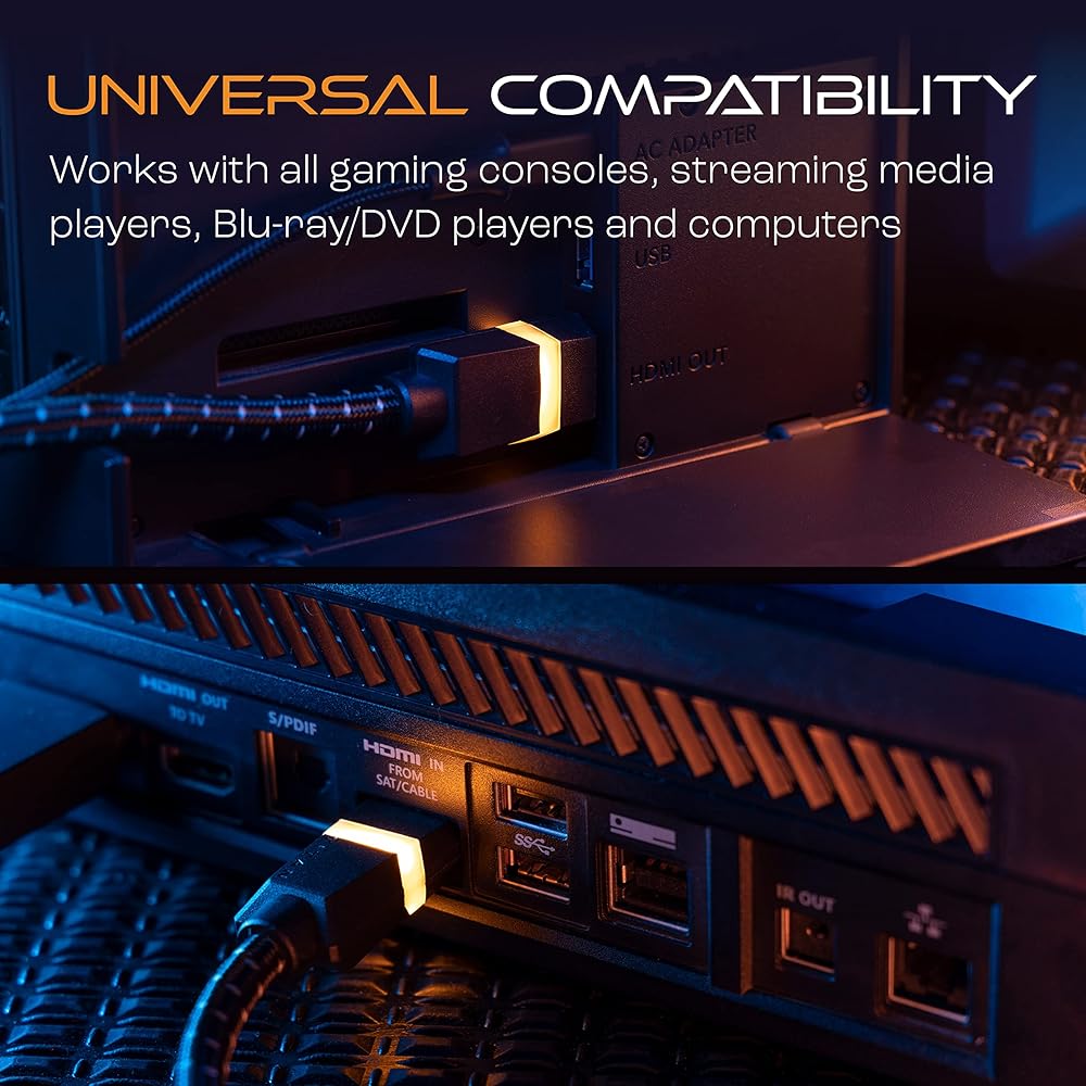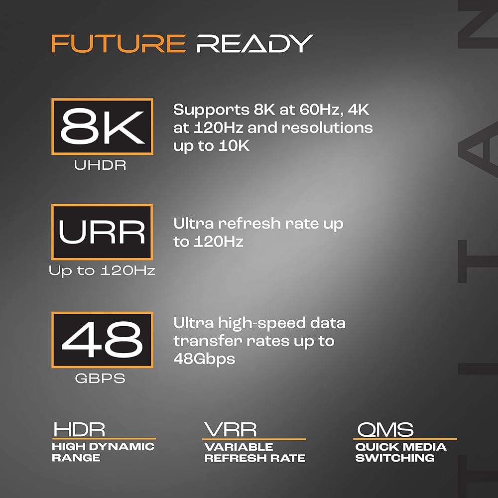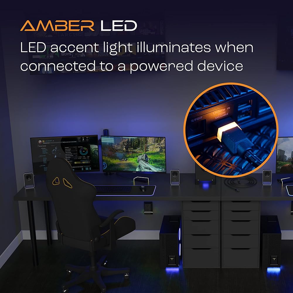 Engage in the ultimate gaming and viewing experience with the Titan 8K Premium Certified Ultra High-Speed HDMI® LED Gaming Cable 2 Pack. Engineered to empower the player, this cable's Dynamic HDR capability unleashes the brightest, clearest picture with richer, more vibrant colors for real-time gaming, virtual reality, enhanced streaming, 3D movies and more. With the ability to transfer data at 48Gbps, this HDMI cable is future-ready for enhanced audio, video and gaming in 8K at 60Hz as well as resolutions up to 10K. Customize your gaming setup with this high-end cable that includes a unique LED feature on each connector. Titan's signature amber LED accent illuminates when connected to a device that's powered up. Not only does it add a splash of color to enhance your gaming setup, it also helps you easily identify your connected equipment. Maximum shielding minimizes electromagnetic interference and boosts data transfer for lag-free, immersive entertainment at its best, keeping you at the forefront of any gaming battle. Its braided cable is resistant to stiffening and damage, and its 10ft. length allows for versatile setups. The cable heads are uniquely styled in a sleek, black housing with an amber LED accent, while the gold-plated contacts provide crystal-clear transfer of video and audio, for amazingly rich images in 8K and 4K Ultra HD. Take your gaming, streaming and more to the next level with the Titan 8K Premium Certified Ultra High-Speed HDMI® LED Gaming Cable.