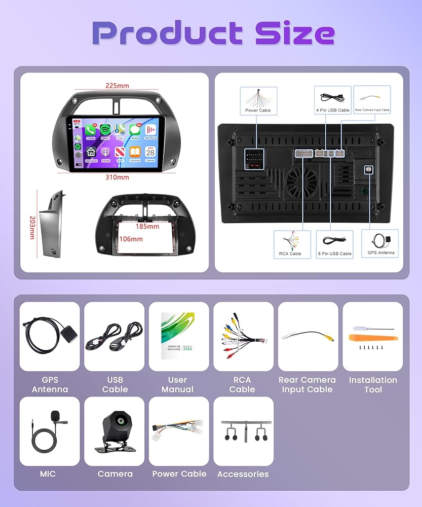 【Android Touchscreen Stereo for Toyota RAV4】Compatible Vehicles: for Toyota RAV4 2001-2006. Designed and Contoured to Match Factory Dashboard, Factory Style Texture Design, 9'' 2.5D Tempered Glass Mirror auto radio player. RAM 1G + ROM 32G memory, High definition 1080P, full capacitance touch screen for easy operation, well designed user interface for car only. Support split screen.