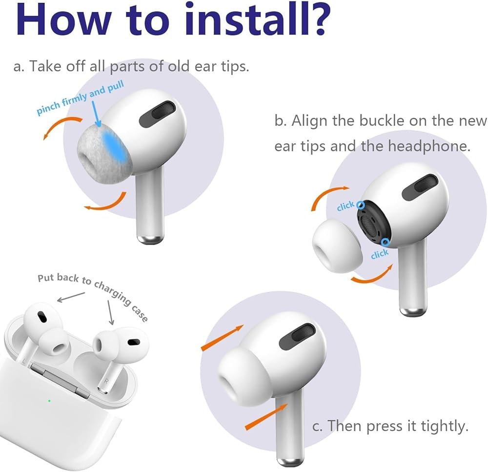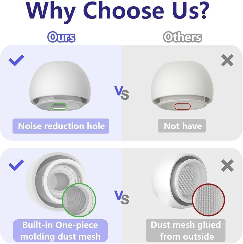 Built-In Dust Mesh: Each ear tips features a built-in dust mesh ensuring that no dust or debris gets into your Airpods, and prevent sweat from entering as well. The one-piece molding process makes it firmer and secure, preventing them from falling off