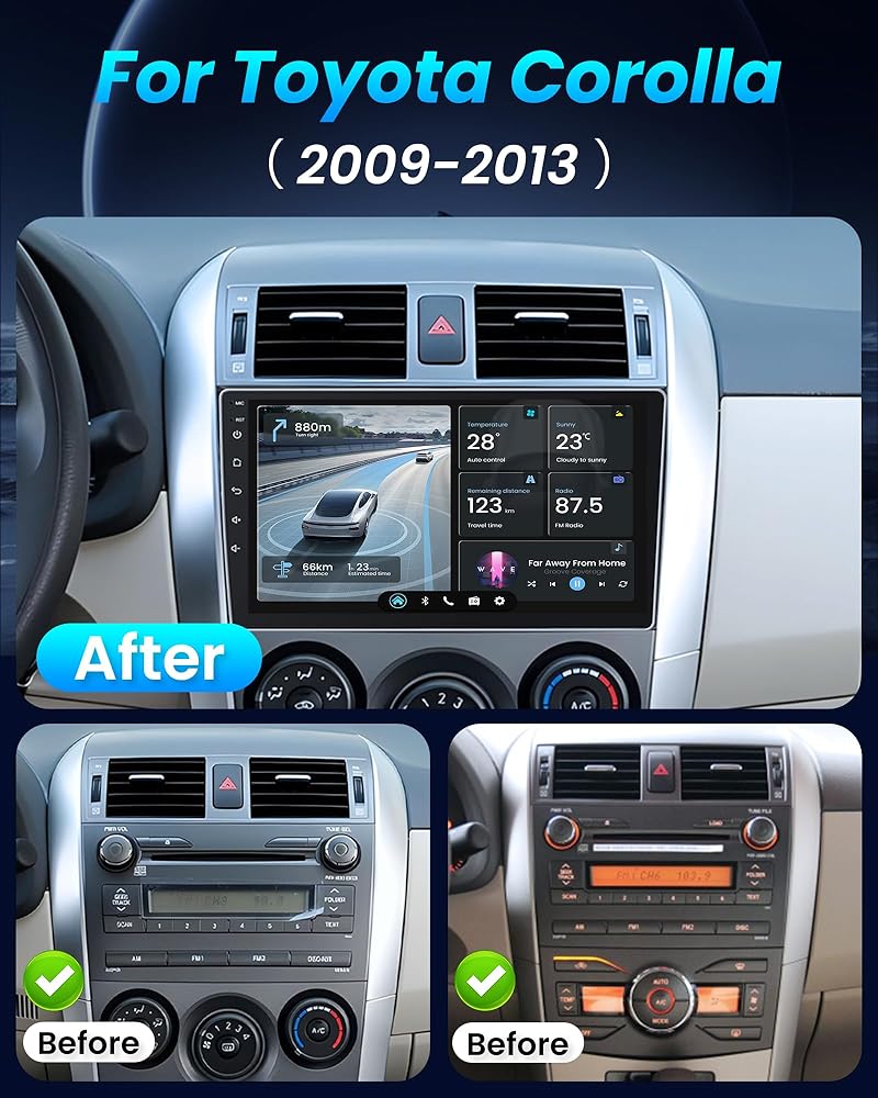【Compatible Vehicles】Android Apple Carplay Car Stereo for Toyota Corolla with air outlet 2009 2010 2011 2012 2013, designed and contoured to match factory dashboard, High-Grade ABS plastic structure, factory style texture design. Screen Size:9 Inch; Resolution: 1280*800; Memory:4GB (RAM)+32GB (ROM)