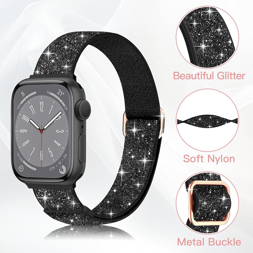 Wipalor Slim Sparkly Stretchy Band Fit Bling Apple Watch Bands for Women 42mm 41mm 40mm 38mm, Elastic Sport Thin Nylon iWatch Bands for Glitter Christmas iPhone Watch Series 11 10 9 8 7 6 5 4 3 SE-Black