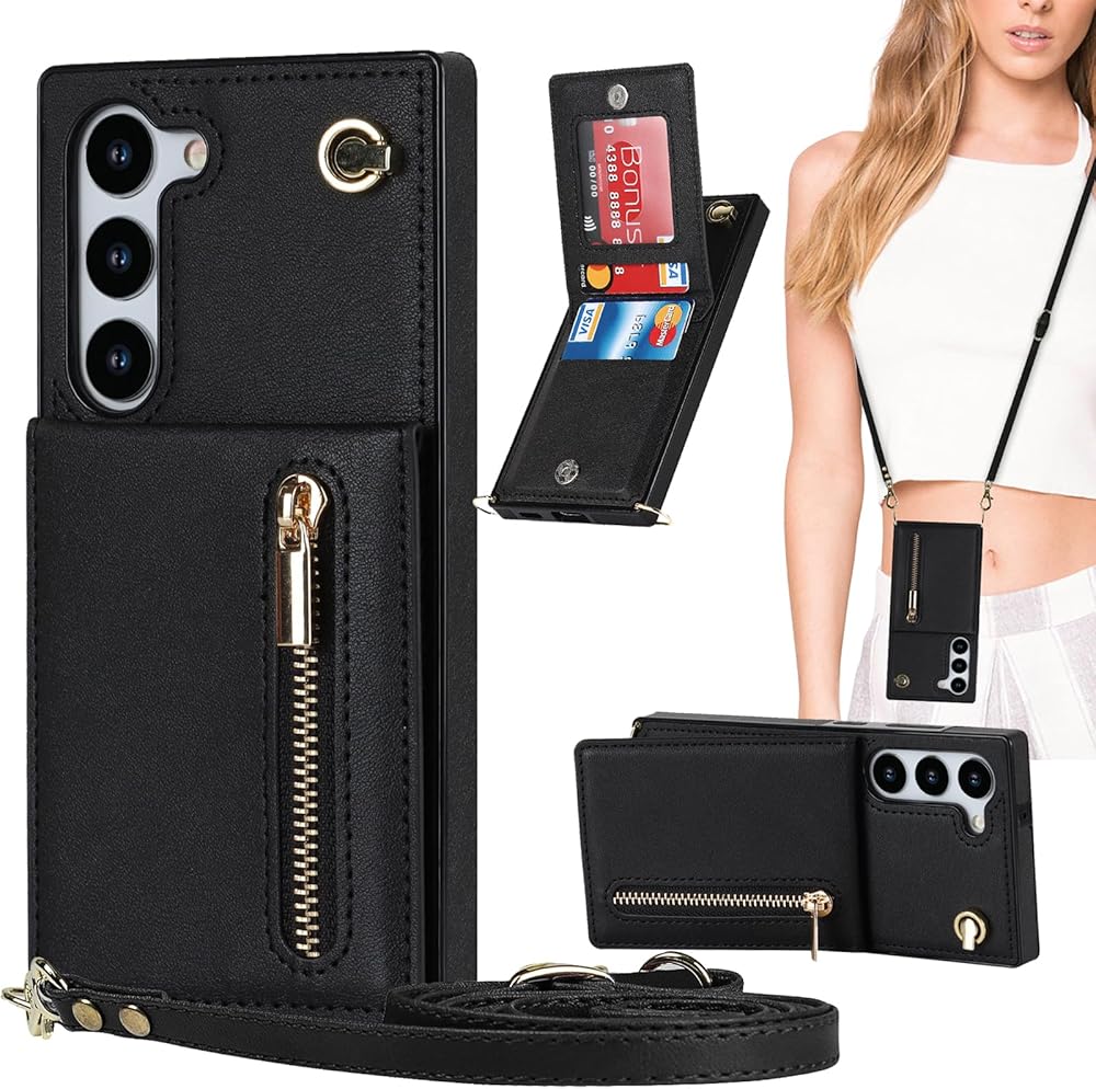 Crossbody Women Wallet Case for Samsung Galaxy S23 Plus with Card Holder, Removable Shoulder Lanyard Strap Purse Cover for Samsung Galaxy S23 Plus Zipper Phone Case Black