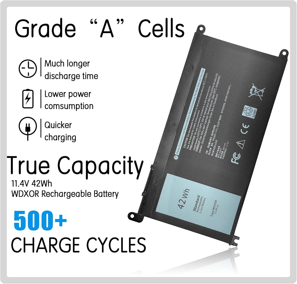 【Specifications】 Model Name: 42Wh Standard Rechargeable Li-ion Battery Type WDX0R 11.4V ,Battery Type: Lithium_ion , Voltage: 11.4V Capacity: 42WH ; Cells: 3-Cell; Color: Black Condition : New; Battery life: Around 1000 recharge cycles; Packages includes: 1x WDX0R Laptop Battery,2 x Free Screwdrivers,1x Instruction for Laptop Battery .