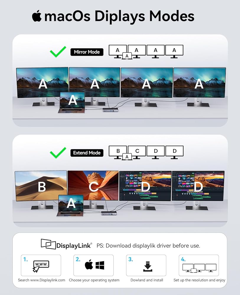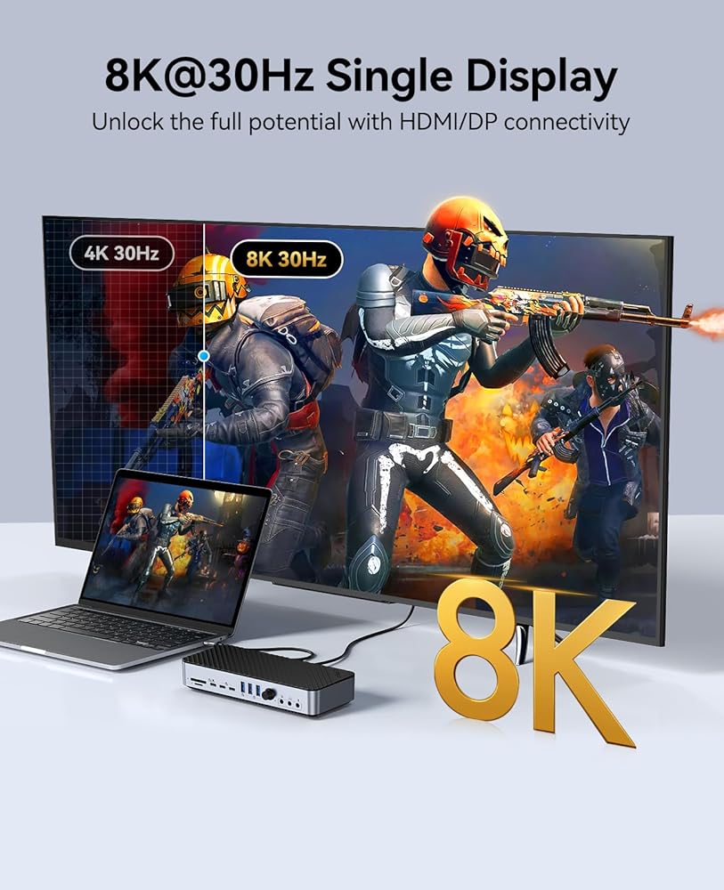 Quad Display Support & 8K Resolution: Experience enhanced productivity with quad display support, delivering up to 8K@30Hz on a single monitor or 4K@60Hz on multiple monitors. Ideal for professionals, gamers, and creatives who need high-resolution visuals and expanded screen real estate. (Note: DisplayLink driver required for use.)