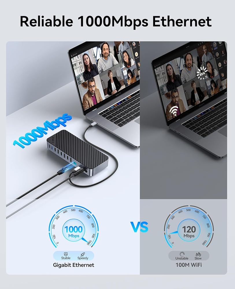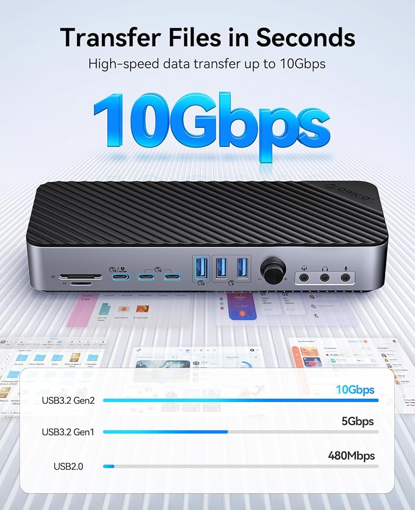 Ultra-Fast 10Gbps Data Transfer: Equipped with USB 3.2 Gen2 ports, this docking station supports blazing-fast data transfer speeds of up to 10Gbps. Transfer large files, HD videos, or project materials in seconds, making it perfect for video editing, gaming, and data-intensive tasks