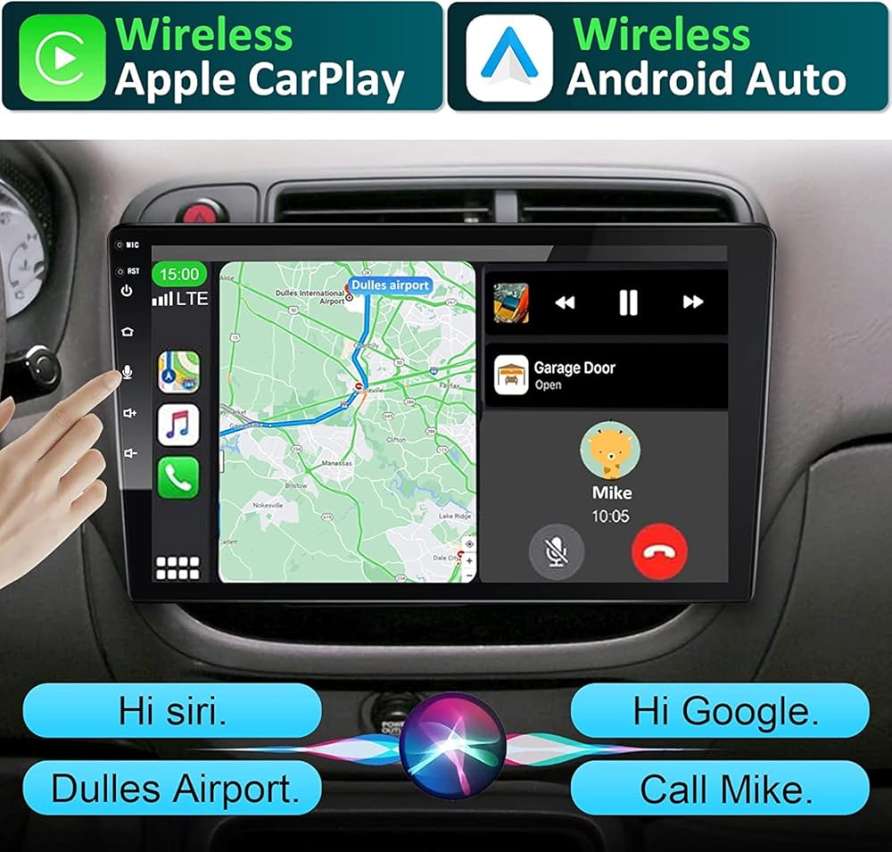 [ Wireless Apple CarPlay and Wireless Android Auto ] - Single din car stereo with Wireless Apple CarPlay & Android Auto, Siri or Google just become your personal assistant on your journey; it will help you make/return and listen to voicemails calls, send/read and reply to text messages, access all your favorite music and track information right on your touch screen car stereo, and find the quickest routes to your destination onto your apple car play