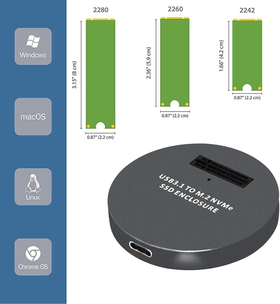 Compatible Multi OS, Windows 7/ 8/ 8.1/ 10/ 11/ Linux/ MAC. Plug-and-play, no additional drivers required. Bus powered, does not need an external power supply.This USB3.0 to M.2 SSD Enclosure only for NVMe PCIE M-Key / B+M connectors M.2 SSD. Applicable to sizes 2242 / 2260 / 2280 solid state drivers.