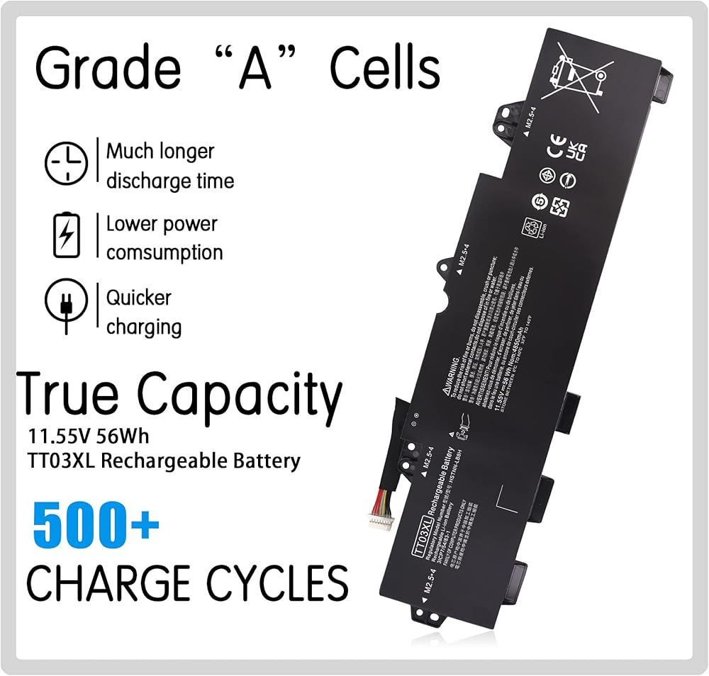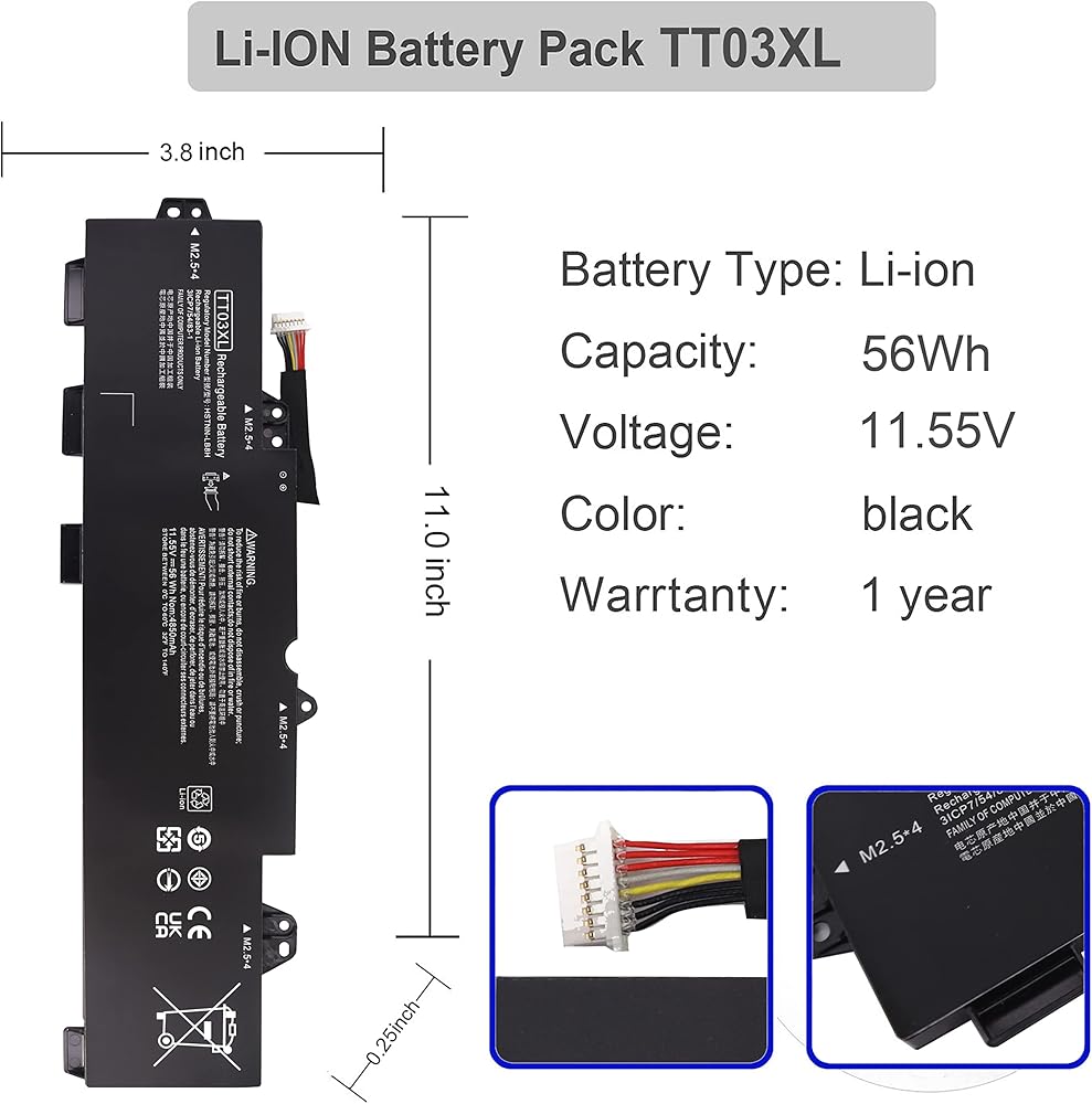 【TT03XL battery gives new life to your laptop】TT03XL Rechargeable Battery 11.55V/ 56WH/ 4850mAh;Battery type: Li-ion; Color: Black; Condition: Brand new; Voltage: 100% New from Manufacturer. Making the overall battery life more than 1000 cycles.932824-421 HP Battery has give your laptop a great battery life. It stays charged for a good amount of time when not plugged in.TT03056XL battery also include 2 free screwdrivers to make your installation easier .