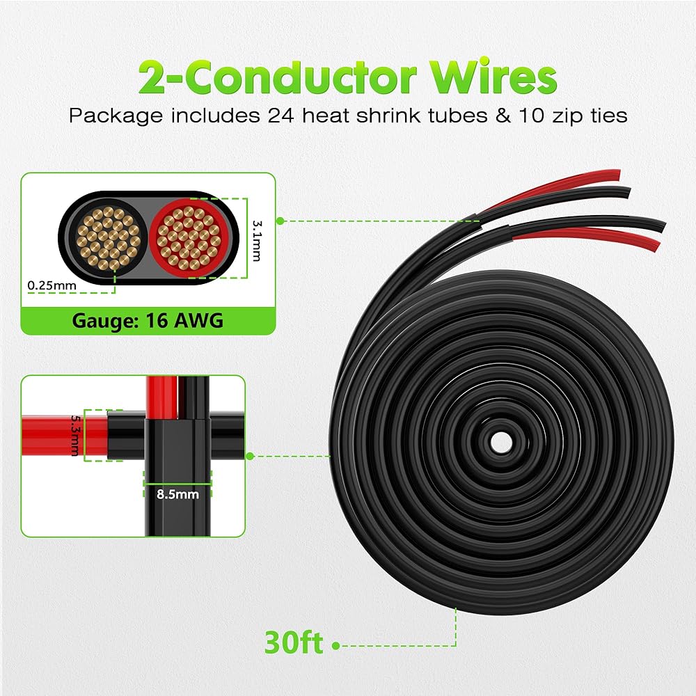 【Easy to Use & Customize】 With a generous 30ft length, this wire is easy to strip and cut to any desired length. Plus, it comes with 24 Heat Shrink Tubes and 10 Zip Ties to enhance insulation and streamline installation