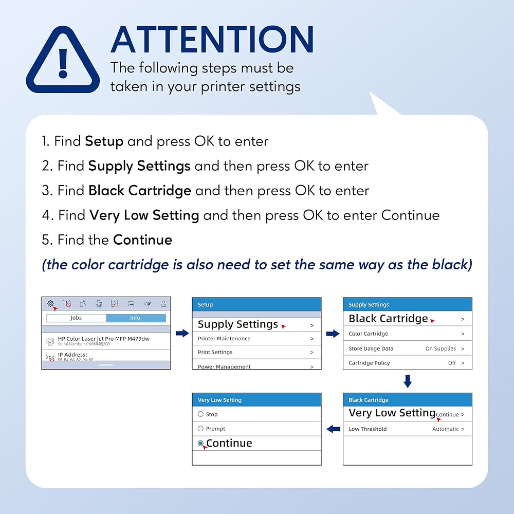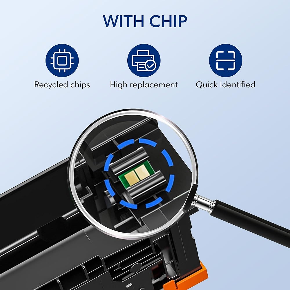 Recycled Original chips: (With chip)The 414a toner cartridges (4PACK) use recycled chips, which is environmentally friendly and allows the printer to respond quickly,Easy to be installed and recognized,Due to the use of recycled original chips,the printer will display"Cartridge Low",this will not affect your use. You can check the instructions card for correct installation