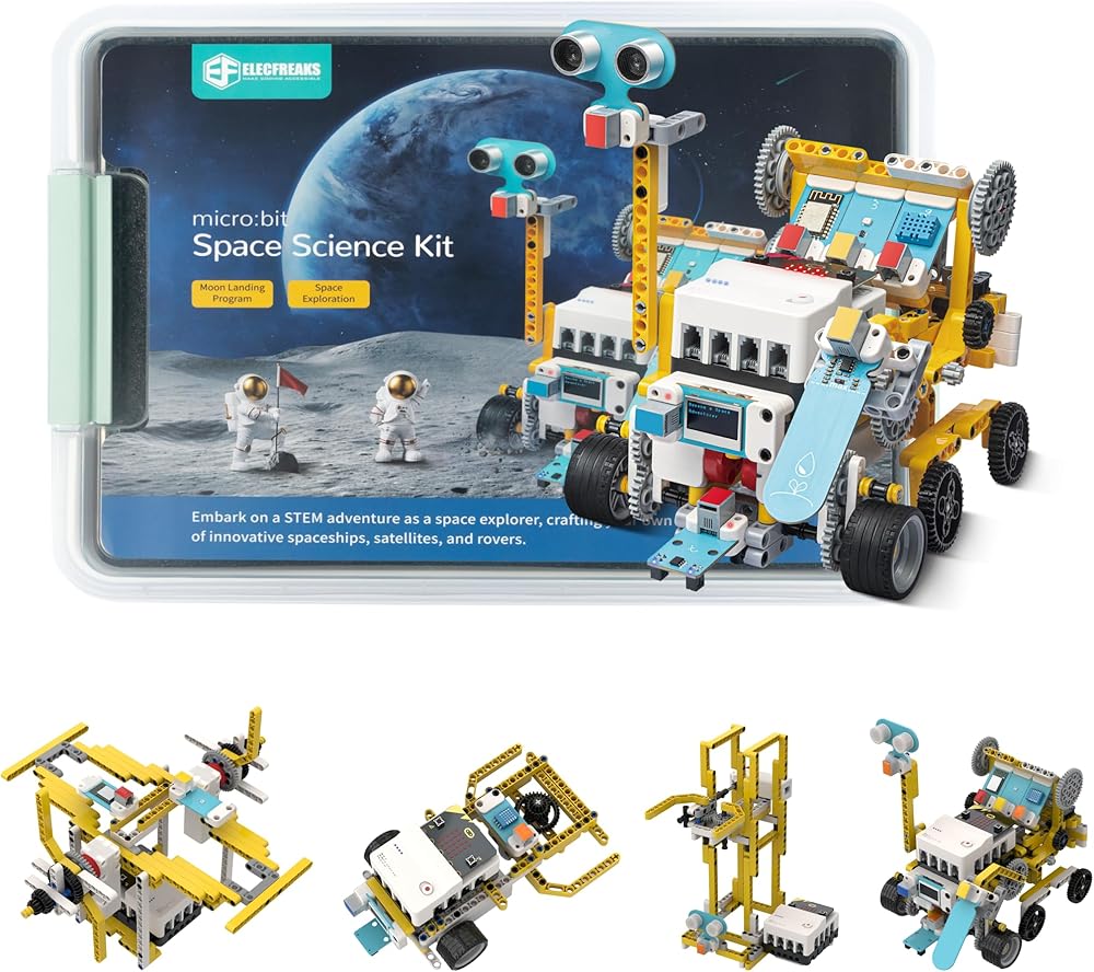 Space Theme: ELECFREAKS micro:bit Space Kit has a wealth of components and interactive experiences. Students can build rockets, space shuttles, lunar landers, etc. It is an enlightenment kit that opens the door to the mysteries of the universe. Cases are constantly updated, you can follow our wiki.