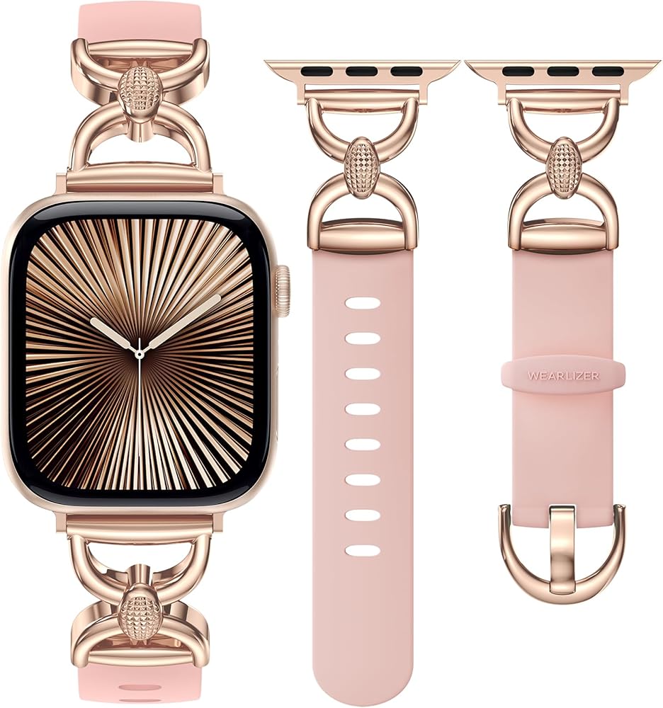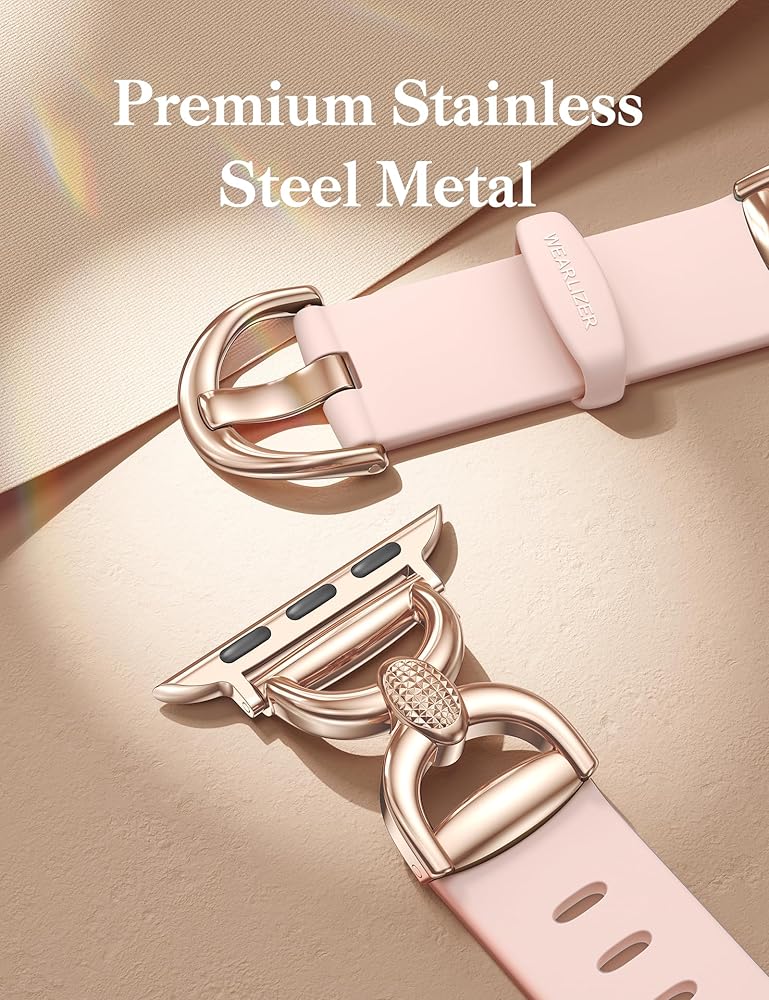 [Wide Compatibility]: Wearlizer Double D-Shaped Metal Design Silicone iWatch band compatible with Apple Watch sport band 38/40/41/42/44/45/46/49mm for series 10/9/8/7/6/5/4/3/2/1/SE/Ultra. Adjustable clasp made it suitable for all wrist size.