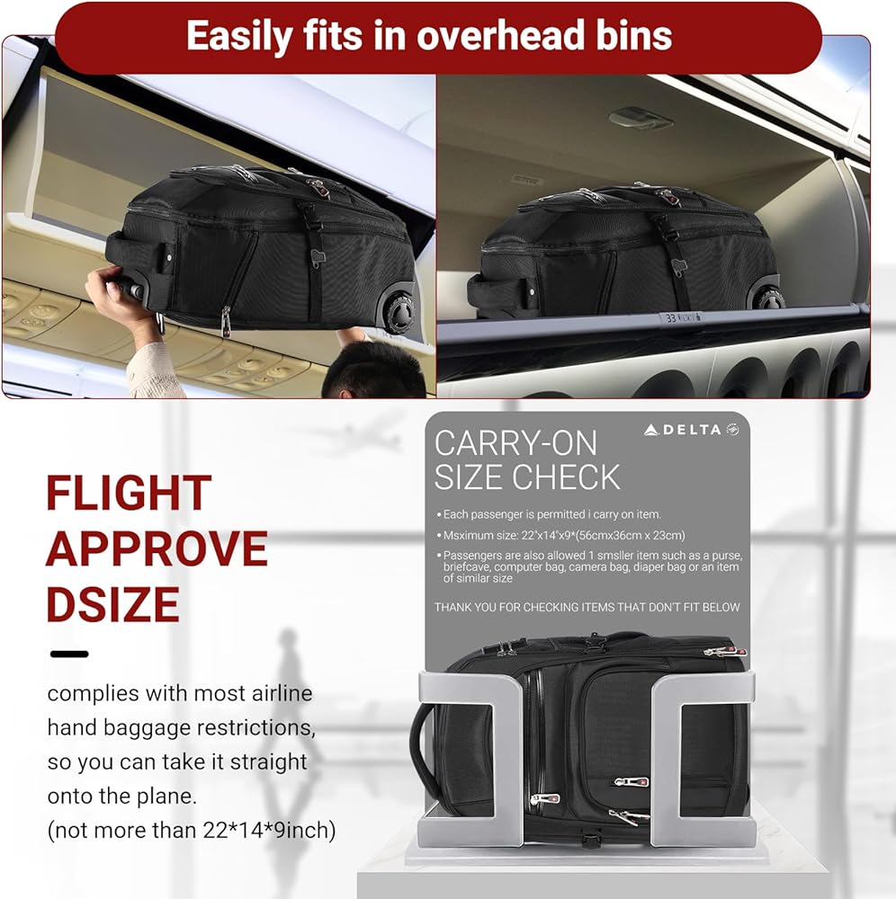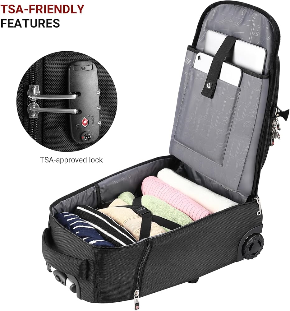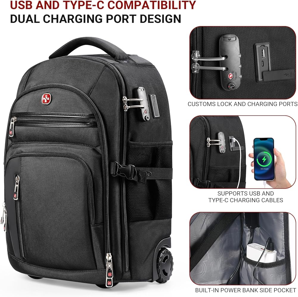 UPGRADED CHARGING STATION: Stay powered up on the go with our upgraded rolling backpack. Featuring both USB and Type-C external charging ports—an uncommon feature in most models—this backpack is a mobile charging station. The added internal side pocket for a power bank ensures you can easily charge your devices while traveling, whether in the airport or outdoors. (This product does not include a battery.)