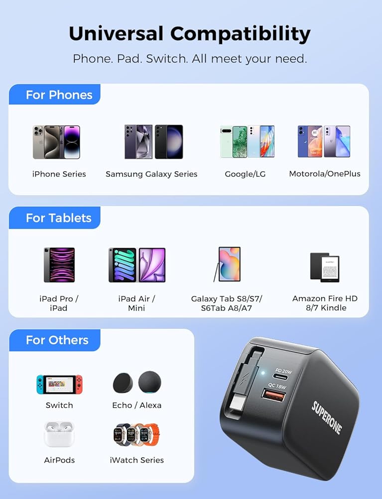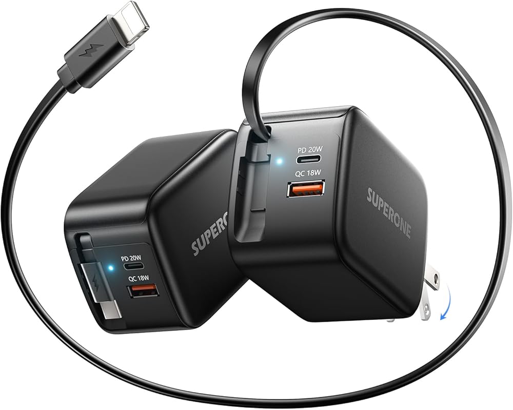 👍[Best for Travel] SUPERONE 3-Port Retractable Lightning Wall Charger is ultra-compact, reducing the need to carry 3 chargers while you travel and outdoor use. With its space-saving design - simply fold the plug, retract the cable, and slip it into your bag without scratching your device screens.