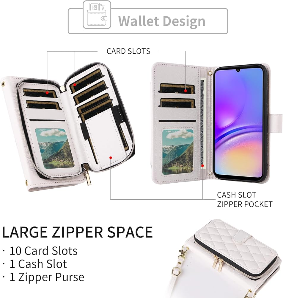 Argyle Wallet Case for Samsung Galaxy A05 with Wrist Strap Shoulder Strap, Zipper Purse PU Leather Flip Credit Card Holder Stand Accessories Cell Phone Cover for Ao5 A 05 Women Girls White