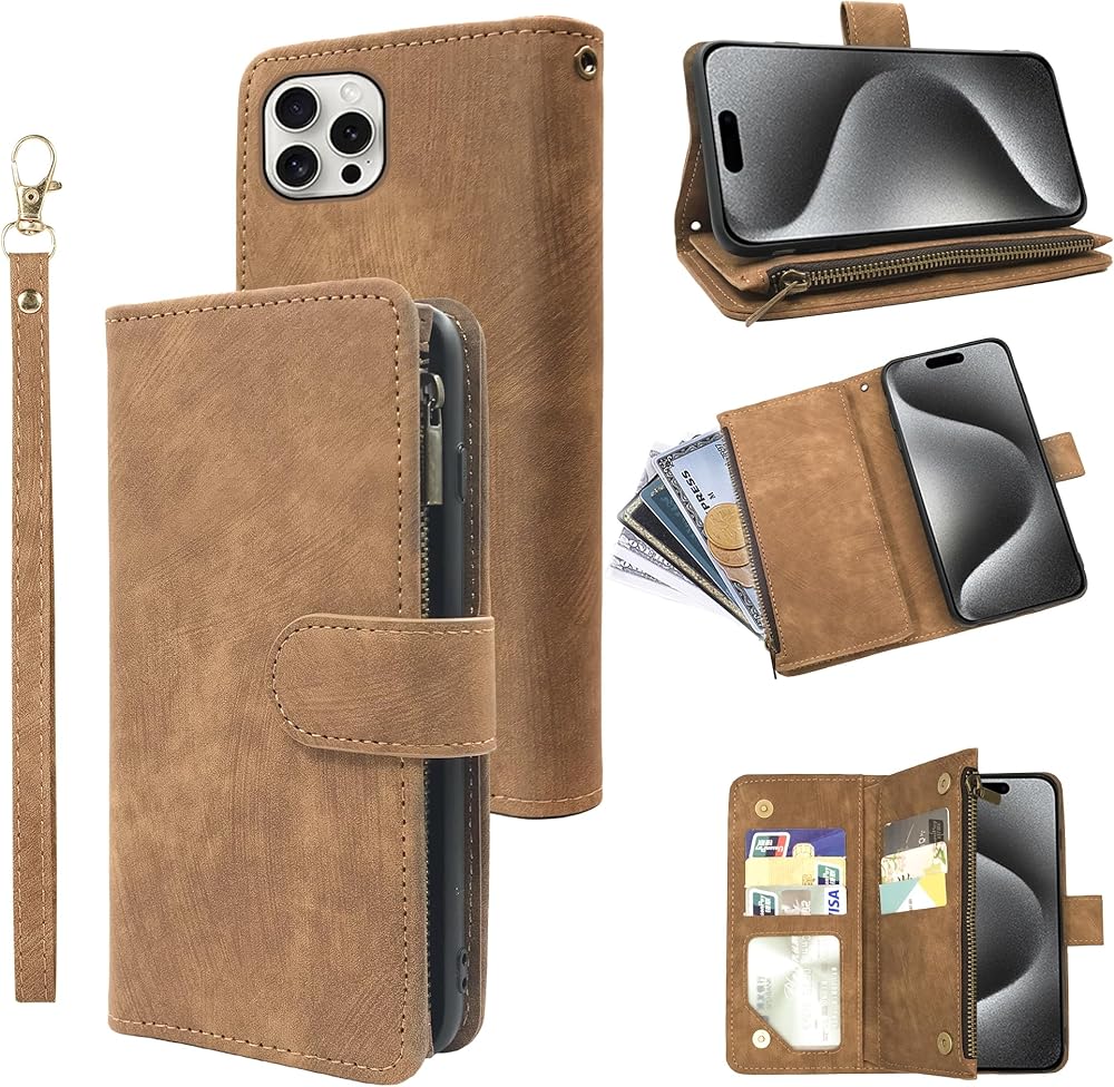Wallet Case for iPhone 16 Pro 6.3 inch with Wrist Strap Lanyard and Premium Vintage Leather Flip Credit Card Holder Stand Accessories Cell Phone Cover for i Phone16 i16 16Pro Women Men Brown