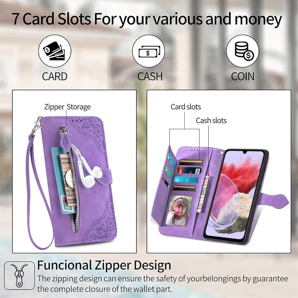 Compatible with Samsung Galaxy M34 5G Wallet Case with Wrist Strap Lanyard and Leather Flip Card Holder Stand Cell Accessories Phone Cover for Samsung Galaxy M34 5G Women Men Purple