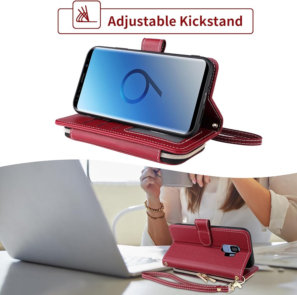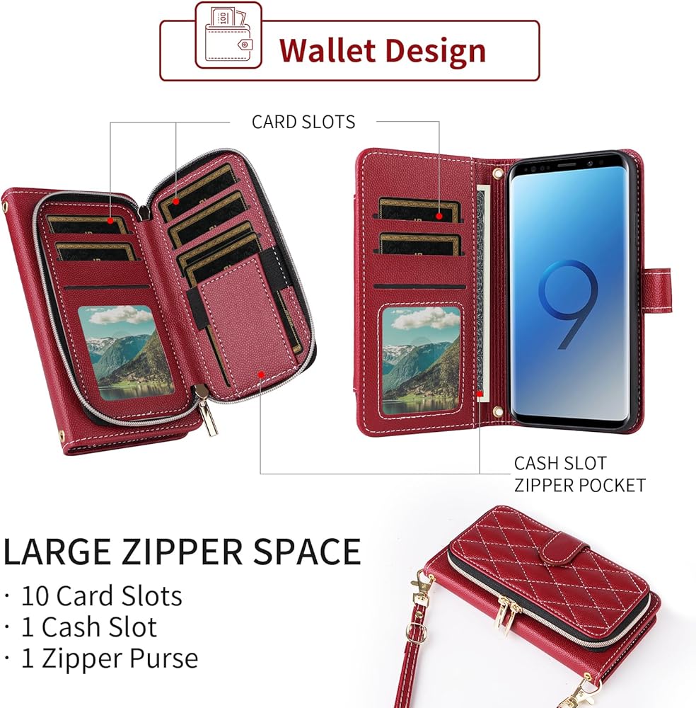 Argyle Wallet Case for Samsung Galaxy S9 with Wrist Strap Shoulder Strap, Zipper PU Leather Flip Credit Card Holder Stand Accessories Cell Phone Cover for S 9 Edge 9S GS9 Women Girls Red