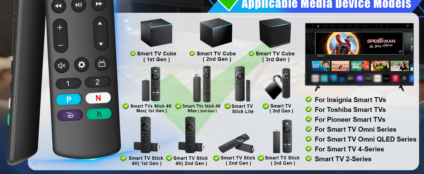 نماذج توافق التلفزيون: بالنسبة لسلسلة Pioneer TVS PN450 / PN651 / PN851 / PN951 ، سلسلة Smart TV Omni ، سلسلة Omni QLED ، سلسلة تلفزيون Smart 4-Series ، TV 2-Series ، لرسائل التلفزيونات الذكية F30 / F20 / F50 / DF710 / DF711 / DF310 / DF510 / DF311 / DF620 ، وسلسلة Toshiba الذكية LF711 / LF621U / LF421U / LF221U / C350 / A810U / A710U / M550 / V35