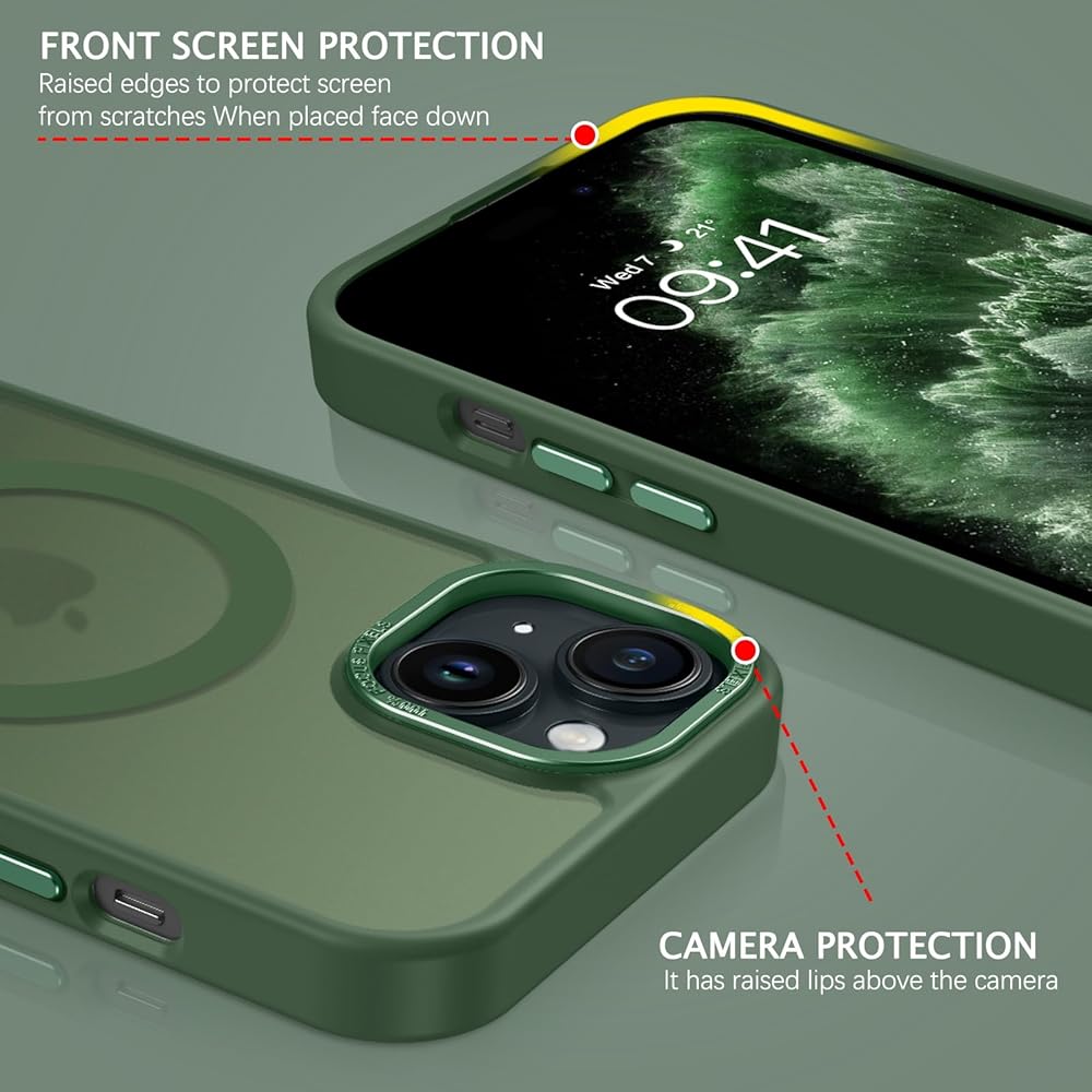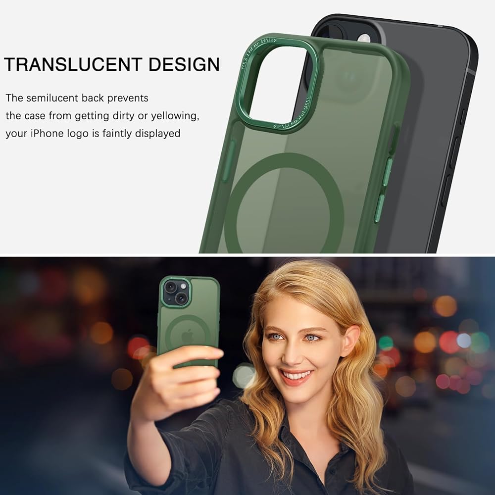 Telaso for iPhone 15 Case, iPhone 15 Phone Case Compatible with Magsafe Translucent Matte Back Soft TPU Bumper Anti-Scratch Military Grade Protective Magnetic Phone Cover for Men, Dark Green