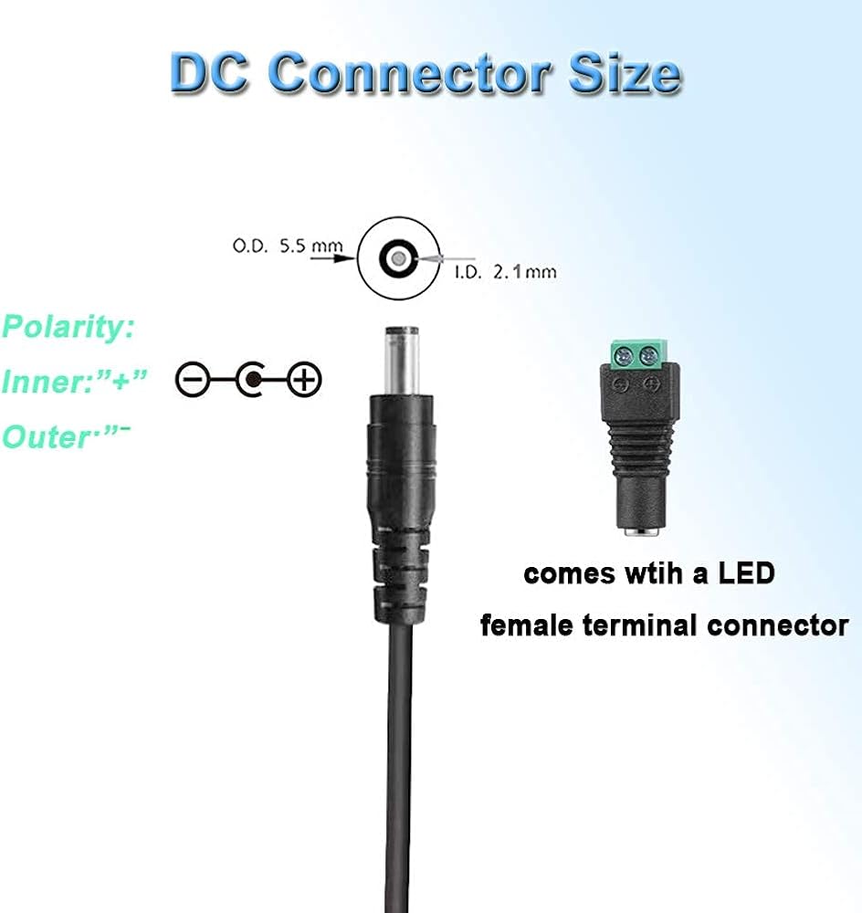 DC OUTPUT JACK SIZE: External diameter is 5.5mm, internal diameter is 2.1mm, not fit for 2.5mm, come with One LED connector terminal included in the package.