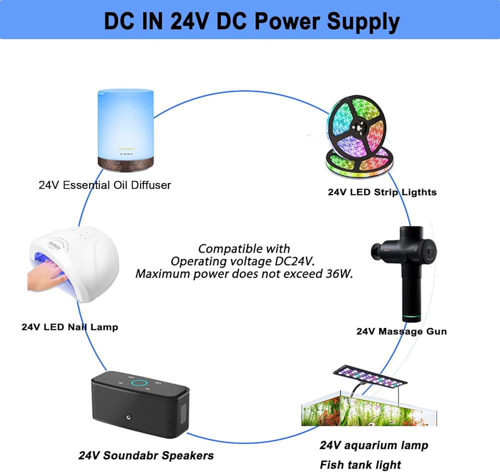 COMPATIBLE WITH: This 24v 1a 1.5a dc power supply cord fit for 5050 2835 rgb led strips lights, Bluetooth speaker, Sound bar, CCTV Security Cameras, WiFi Camera, 3D Printer, DC motor water pump. (Only fit for 24V devices and NOT more than 1.5A ).