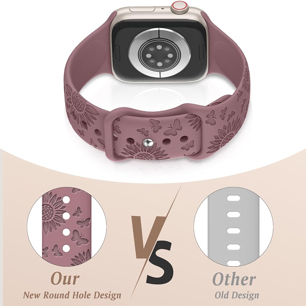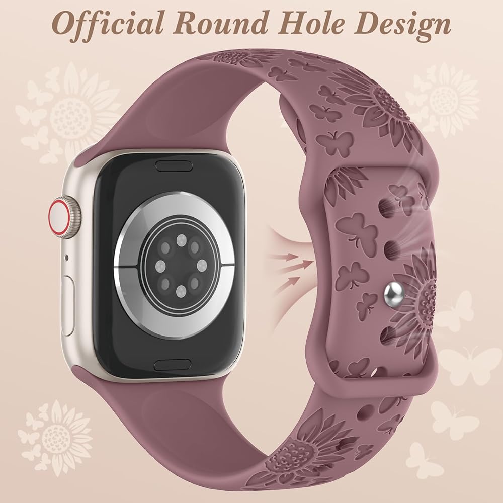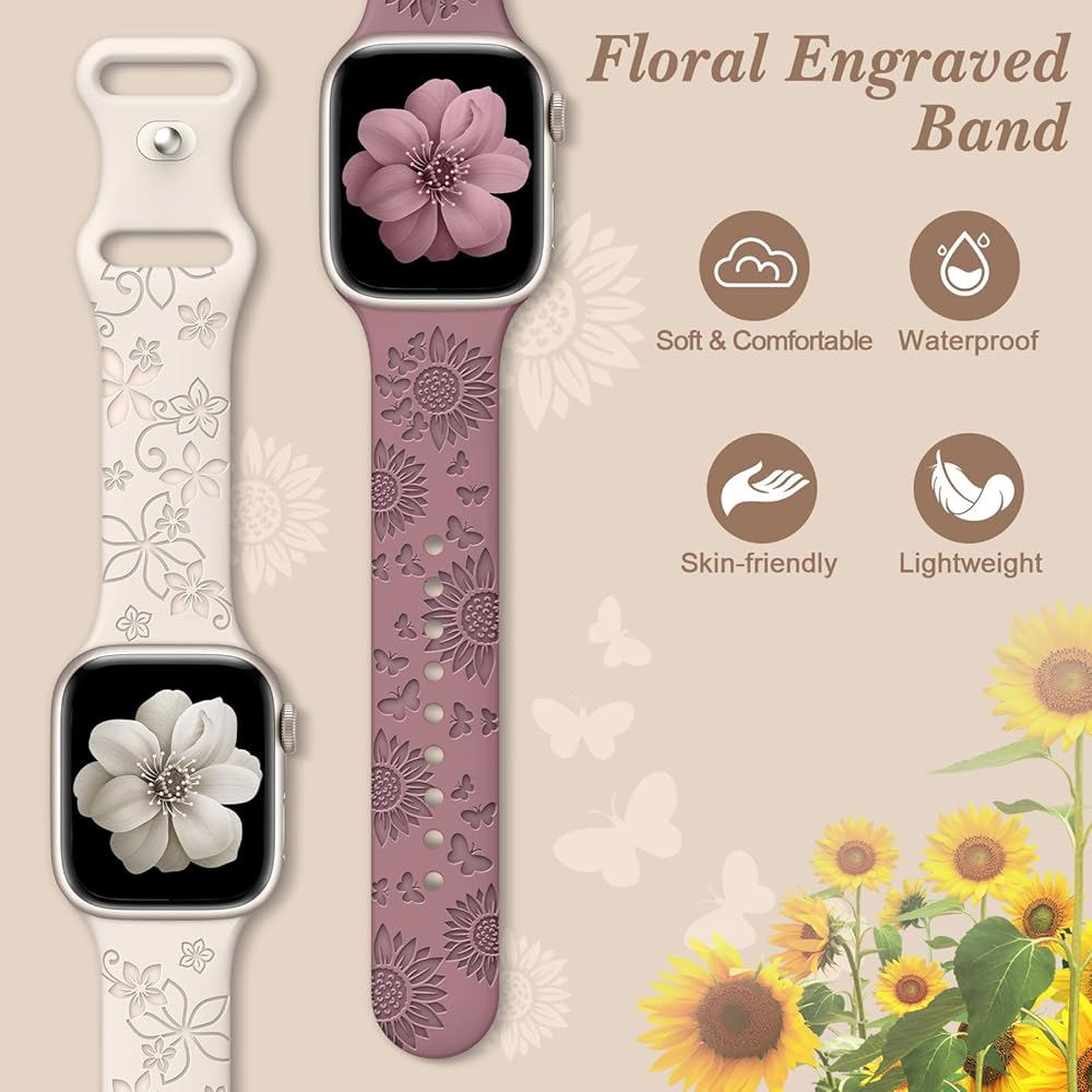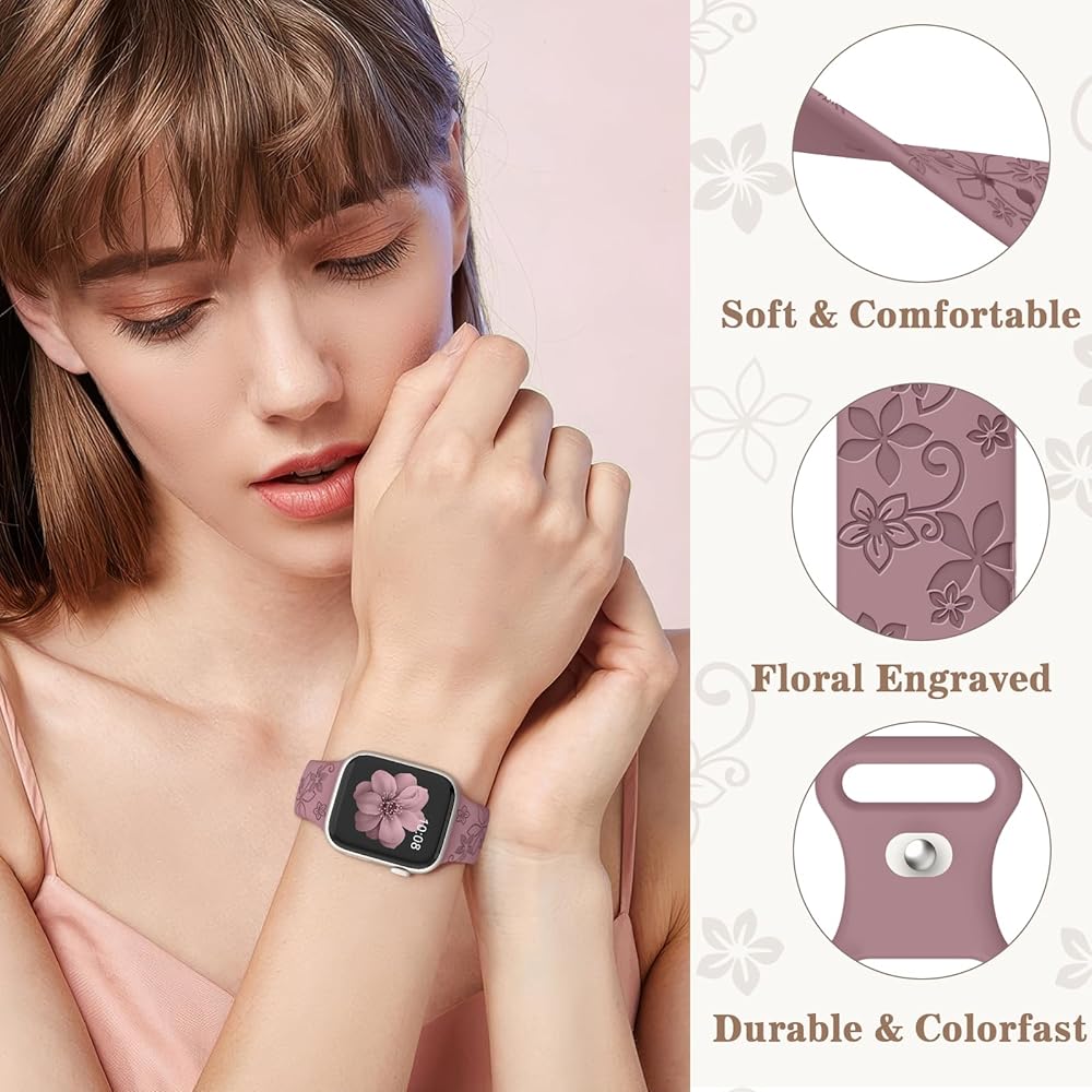 Patenting: Our 6 Pack Sport Floral Engraved Silicone Straps Compatible for apple watch band 49mm 46mm 45mm 44mm 42mm 41mm 40mm 38mm width for Women; Compatible with Apple Watch Ultra 2 Series 10,9,8,7,6 SE,5,4,3,2.NOTE: Just sport band, No watch included.