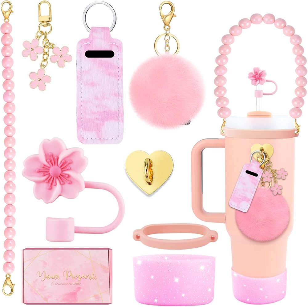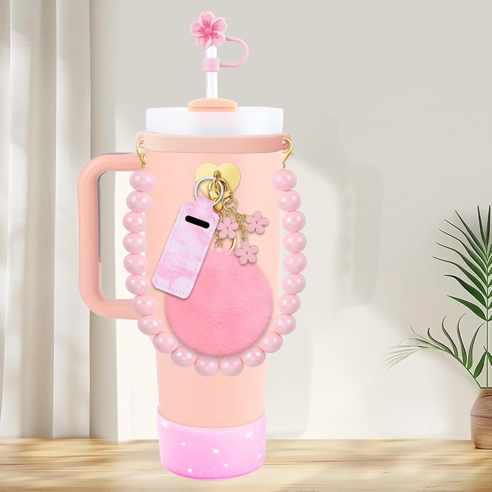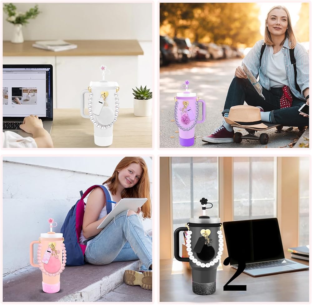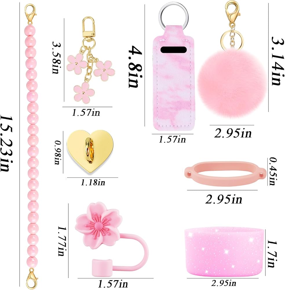 Stanley cup accessories include:straw cover +cup charms+water bottle strap+silicone boot+pompom ball+heart hook