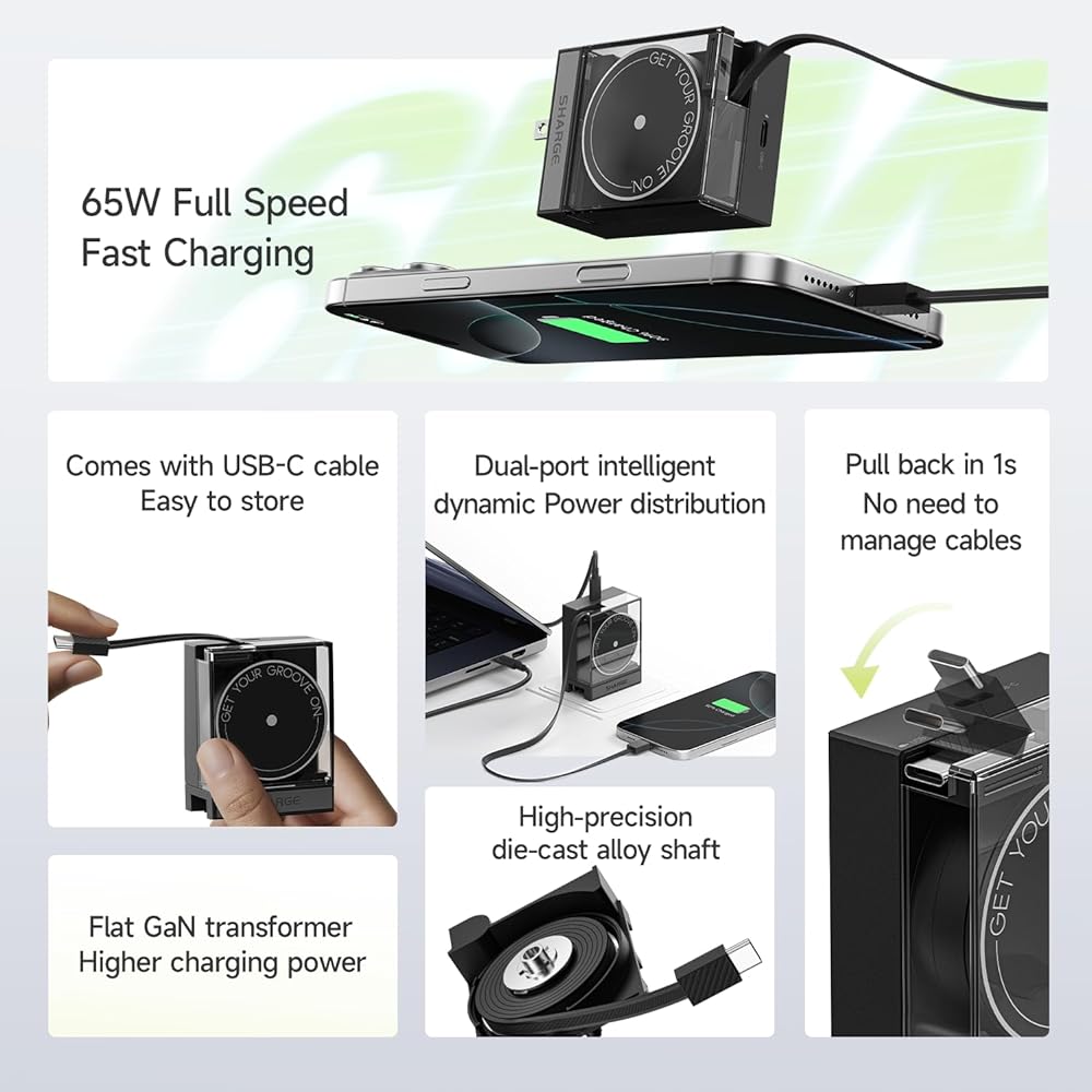 Effortless Convenience with Retractable Cable: Keep your workspace tidy and tangle-free with a 2.3 ft retractable cable. Retraction Instructions: Pull once to lock and start charging, pull again release, and retract
