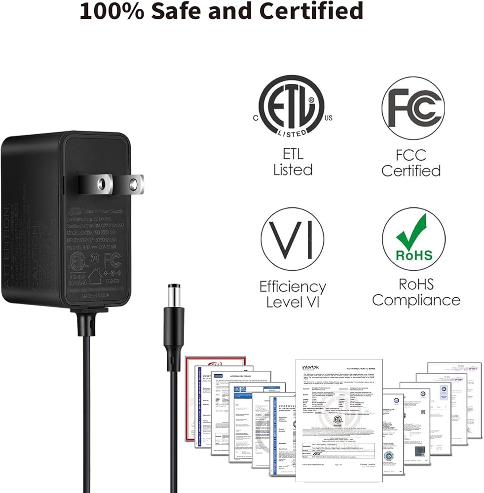 [Specification] Input voltage: AC 100-240V 50/60 Hz, Output: DC 9V 1A (1000mA),Work with 0.5A(500mA) Connector: DC Barrel Plug, center/tip is positive, sleeve is negative, Cable length: 1.5M(5FT)