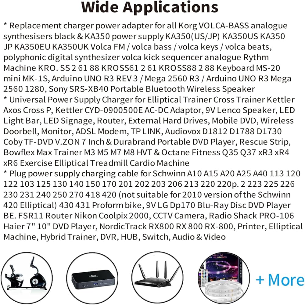 [Compatibility] Compatible with Arduino UNO R3 Mega 2560 1280, Arduino CCTV, Elegoo, IEIK UNO R3,Nixie tube clock, Schwinn elliptical machine, A10 A15 A20 A25 A40 103 120 130 213 220 240 430, Schwinn bike. Works with [devices that require 9V and 1000mA of DC power and physically fits the plug. Please make sure the connector size is 5.5 x 2.1~2.5 mm and that it can fit your applications before purchase.