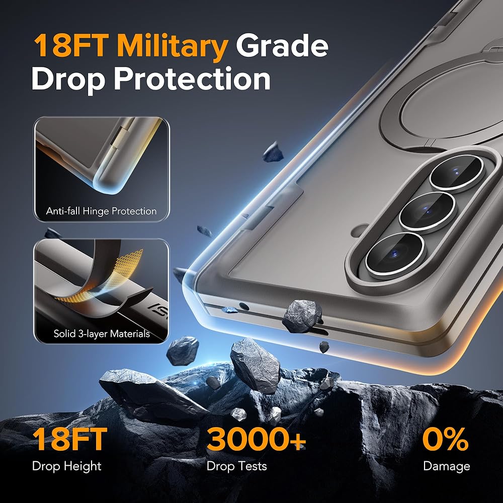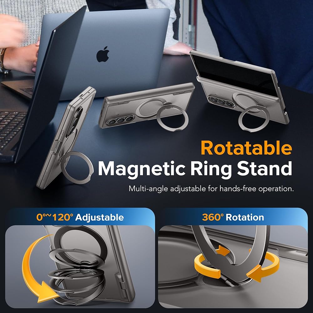 [Enhanced 360° Rotating Magnetic Ring Kickstand] Tired of unadjustable ring stand cases? Our shockproof Zfold6 case with built-in hidden kickstand is the solution. It can easily shift between vertical and horizontal angles, great for hands-free activities like video-watching and conferencing, turning your phone into a tablet quickly. This 360° spin stand is stable, adjustable, and durable. After 30,000 rotation tests, it ensures reliable daily use.